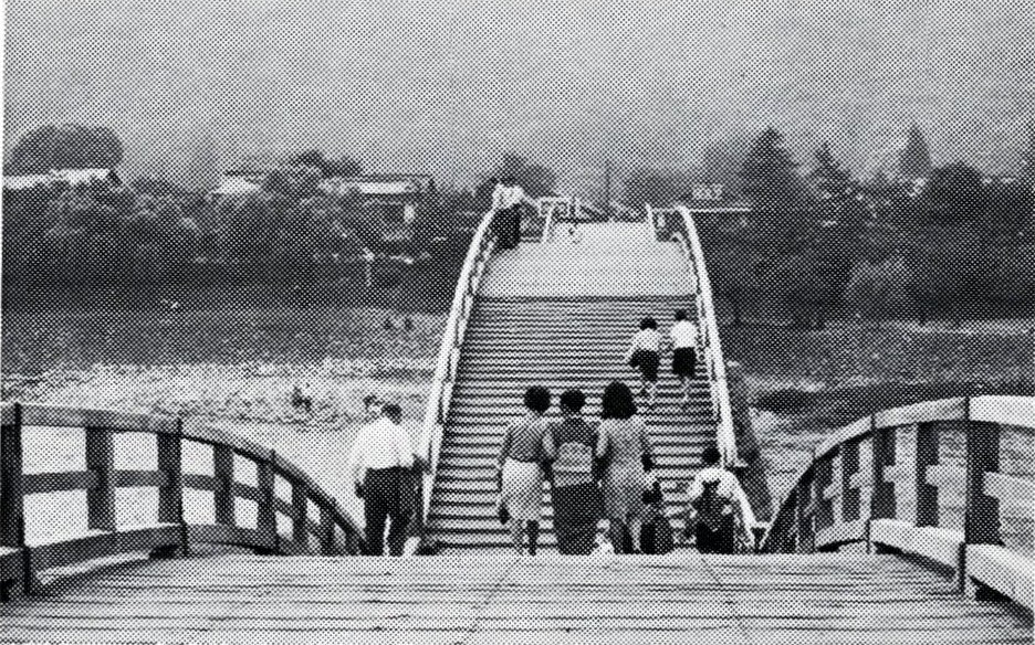 This scheme of spatial composition involves arranging elements so that they cannot be seen in their entirety from a stationary vantage point; only by moving around can we view all of these elements as laid out. The Yasaka and Kiyomizu pagodas in Kyoto are good examples of this, as they are not visible from every point along the street; they dodge into and out of view enjoyably as one walks along. Thus, despite their height, these towers cannot fully serve as landmarks.