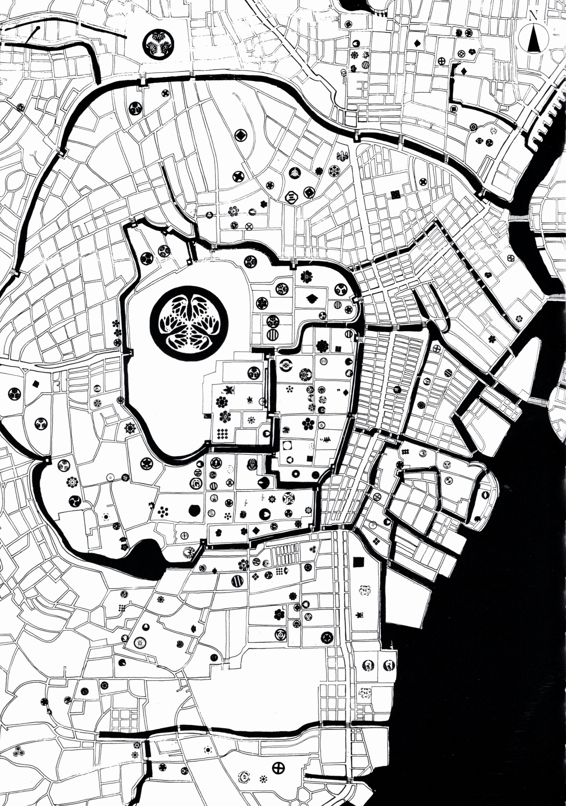 This illustration is composed of two elements: first, the layout of properties as defined by a network pattern of streets, and second, family crests showing the location of feudal lords’ domains along with symbols of landmark temples and shrines. The largely unaltered pattern of streets, moats, and canals allows comparison with the equivalent central part of present-day Tokyo. You would then discover the inaccuracies in this pattern.