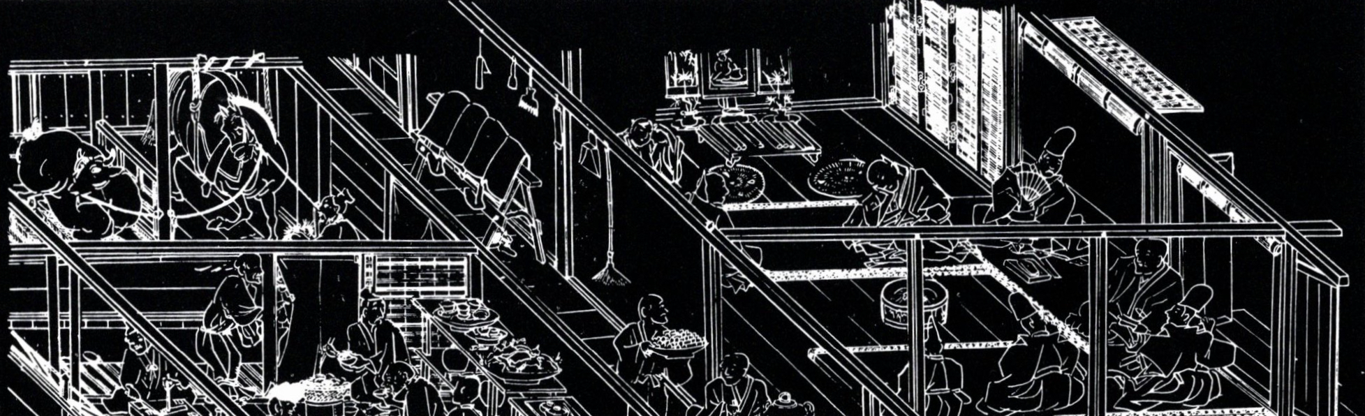 We may find similar examples in the reverse focus and multiple focus of scroll-painting depictions of house interiors with the roofs removed (fukinuki yatai) [Fig. 6] or the [graphic] combination of diverse elements in ukiyo-e print compositions. While not unlike the non-perspective discoveries of the Cubists, instead of their analytical approach, these Japanese pictorial conventions create something like spatial sense of “ma” generated via moving viewpoints, based in the sequential experience of space. Not an analytic vision, but a compound-imagery grasp of space generated sequentially in time.