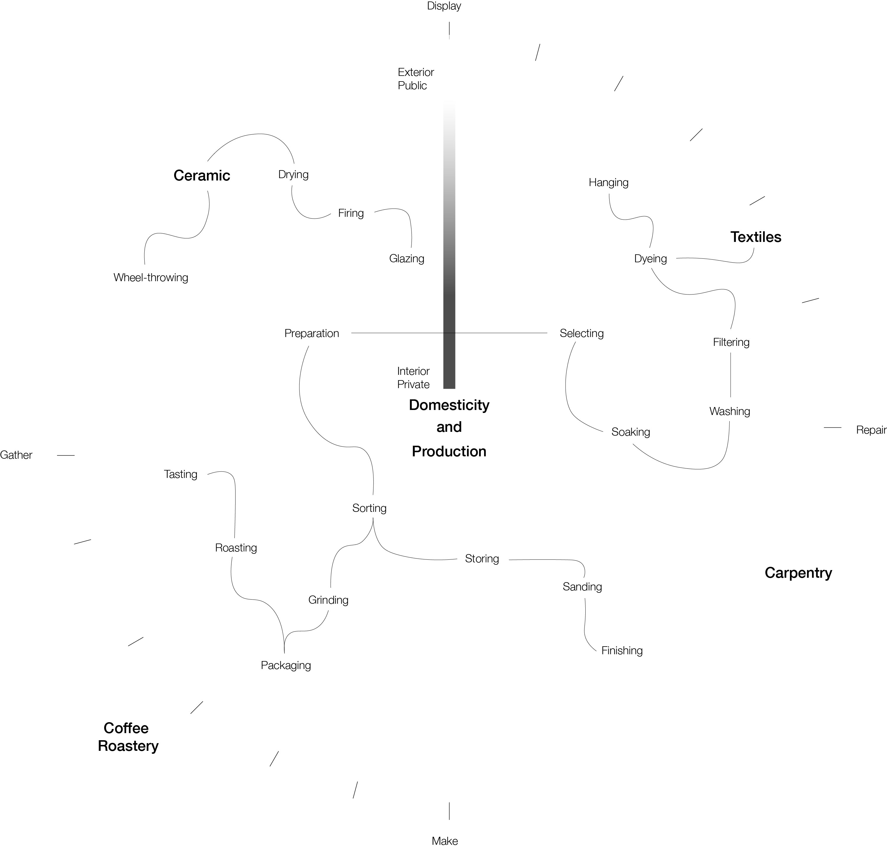 The intersection of production systems and inhabitation illustrates how spaces traditionally dedicated to making—such as craft, food, or repair—overlap with everyday domestic life.
