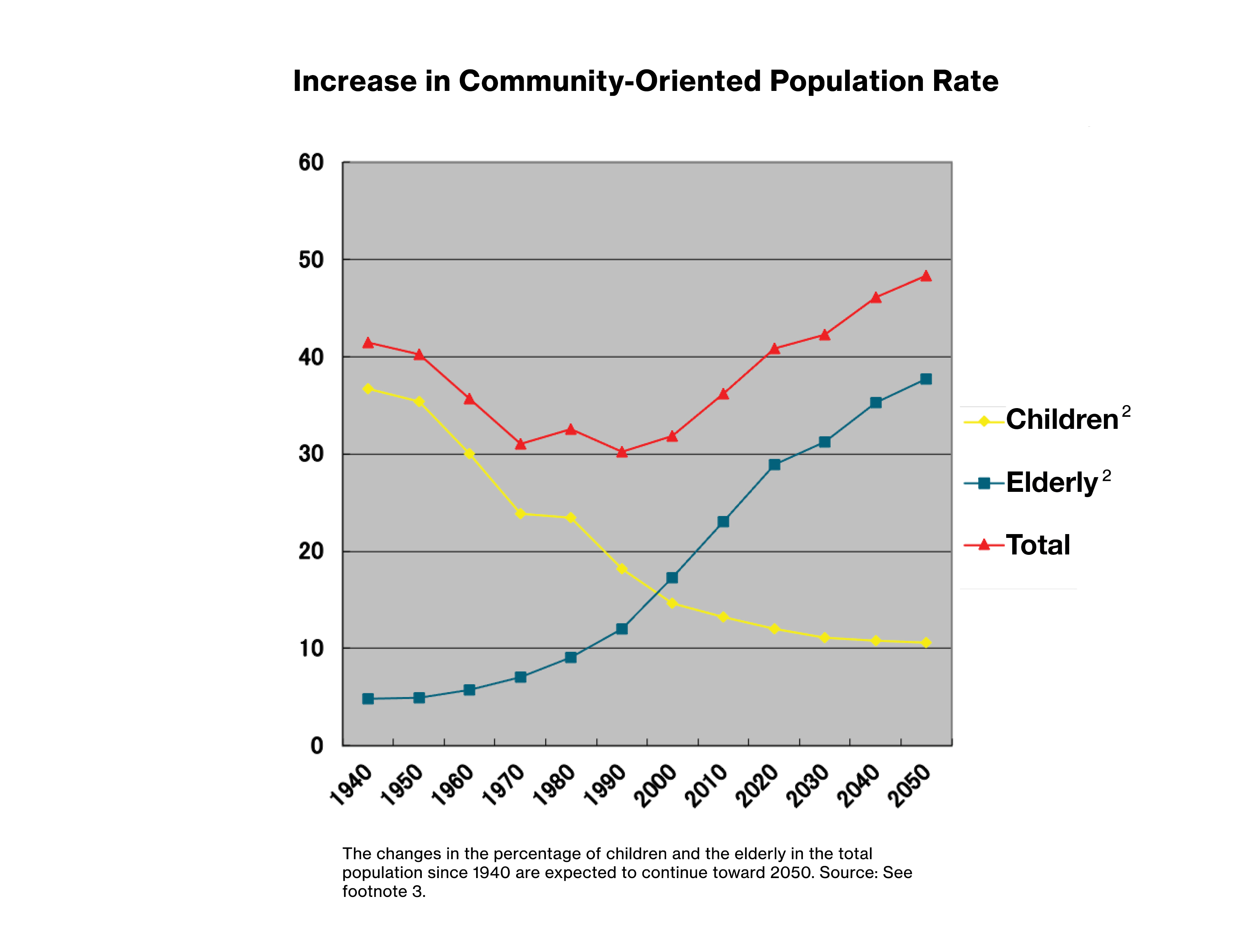 The graph below shows the changes from 1940 to 2050 in the percentages of children and elderly out of the entire population. The percentage of children has continued to decrease while the percentage of elderly increases. Of particular interest is the cumulative percentage of children plus the elderly, which I call the “community-oriented population rate.”