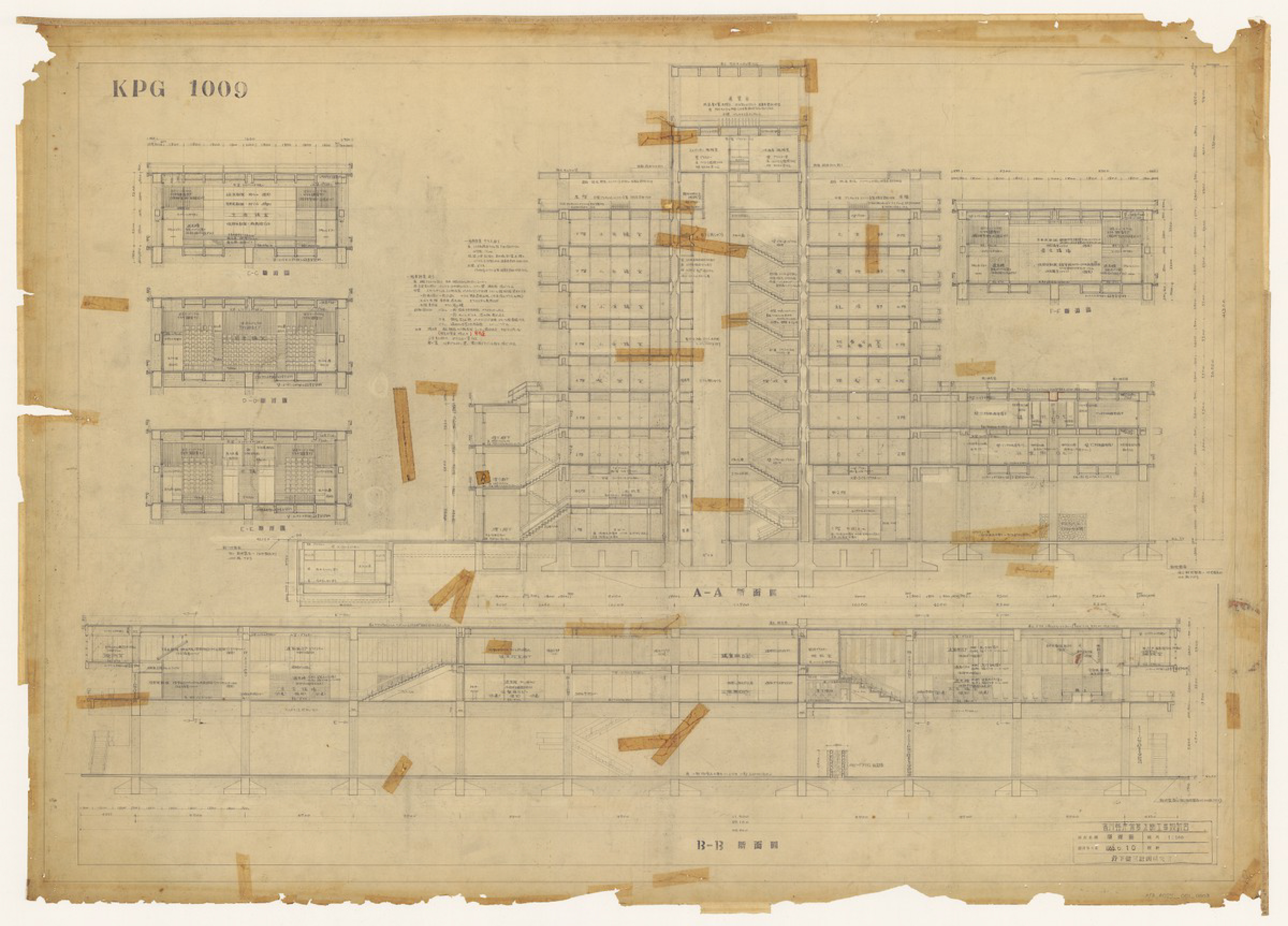 The Kenzō Tange Archive. Gift of Mrs. Takako Tange, 2011. Kagawa Prefectural Government Building. Sections. Courtesy of the Frances Loeb Library, Harvard University Graduate School of Design.