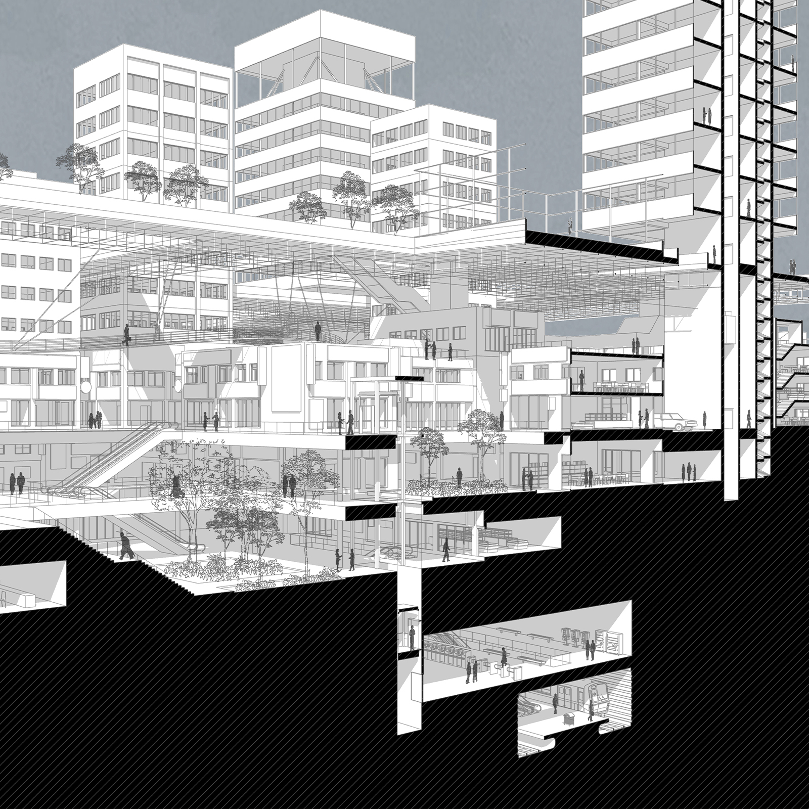 Architecture and infrastructure connect across multiple levels, creating a true sectional urbanism