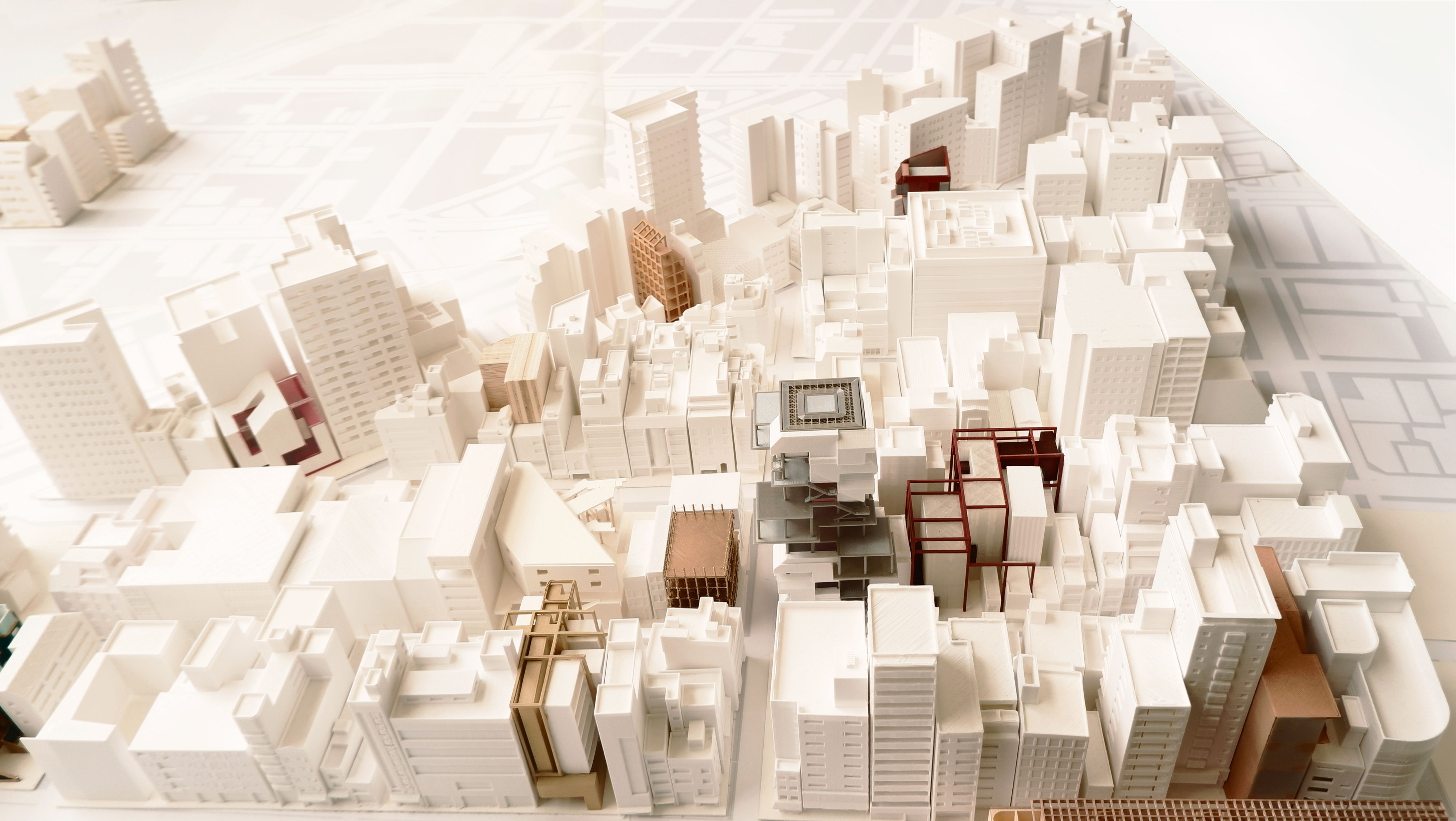 Collective site model demonstrating the juxtaposition of projects. The intention is to combine individual projects (artifacts) to form the basis for the physical and social revitalization of this part of Tokyo.