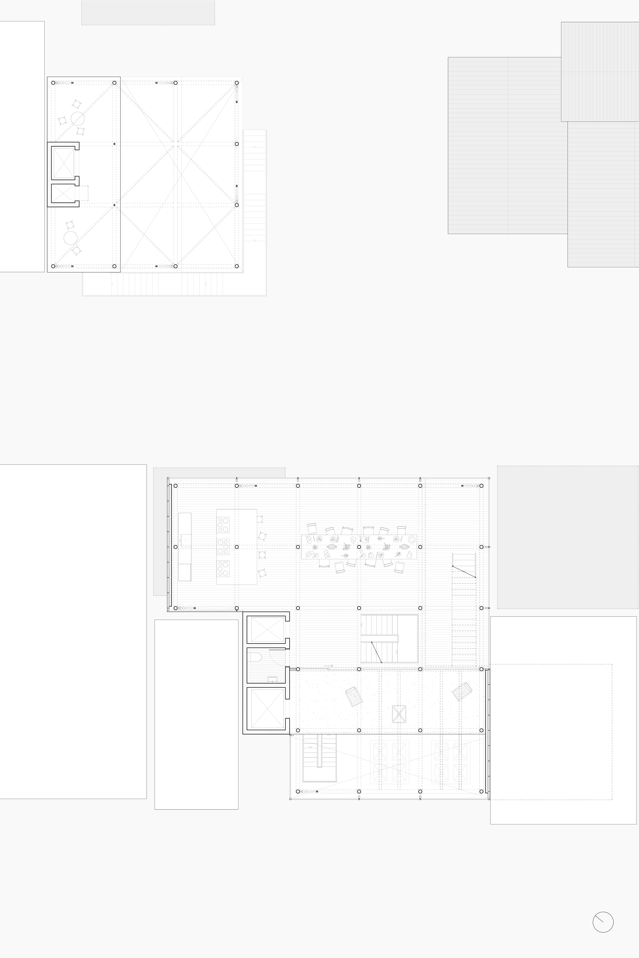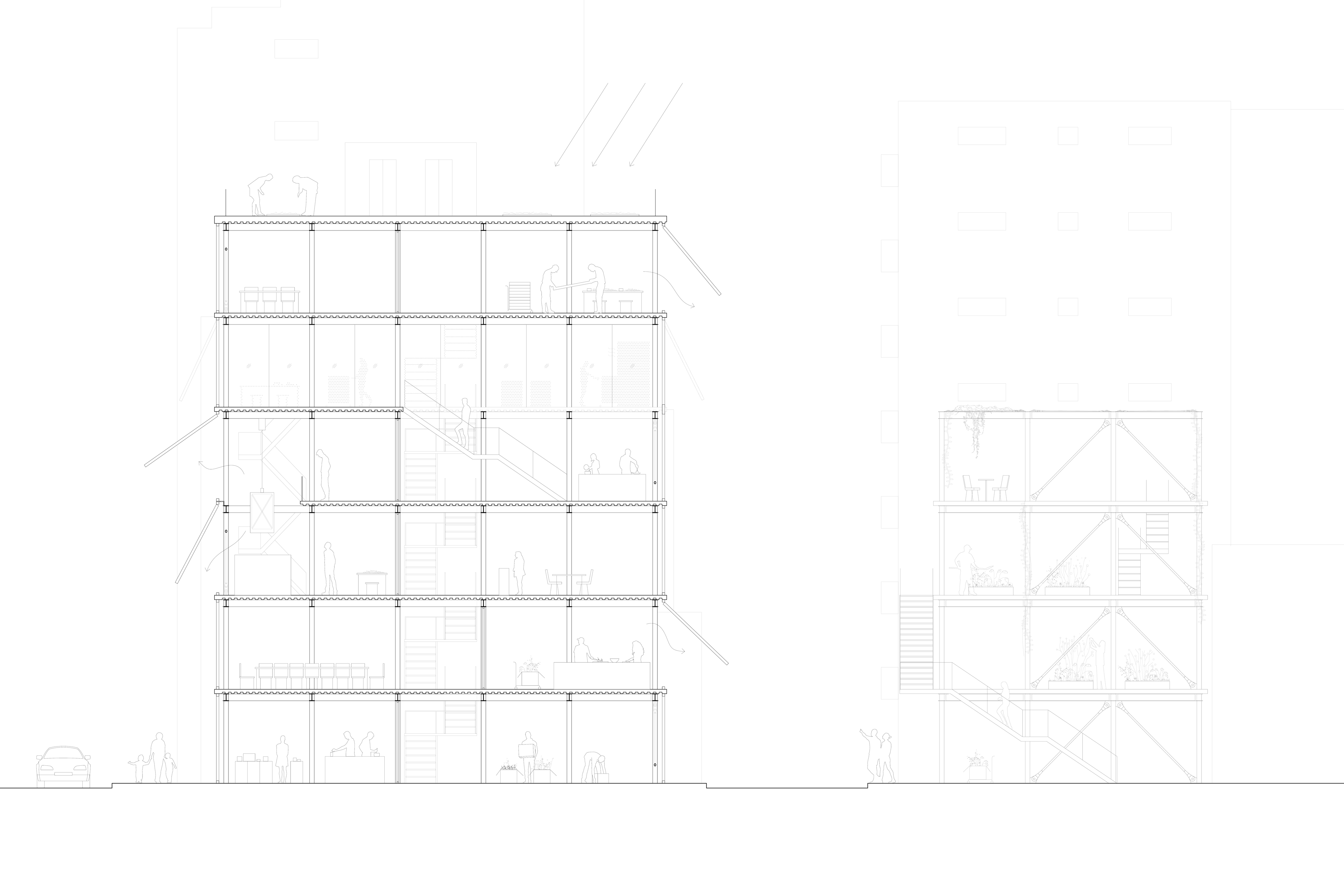 The project includes katsuobushi production, a restaurant, a community kitchen, and an adjacent garden; the programs’ processes are interconnected to create a closed loop system within the project. Katsuobushi is used to make the restaurant’s dashi and the byproducts of production are used for fertilizer to grow vegetables for the restaurant. The architecture supports the connections between these processes, the visitors, and the visitors and food production. The production space is split and stacked, with restaurant and community kitchen space interspersed. A central stair organizes and separates the programs planimetrically while creating visual and physical connections sectionally. Suspended horizontal extensions take advantage of vacant vertical space in the densely developed city.