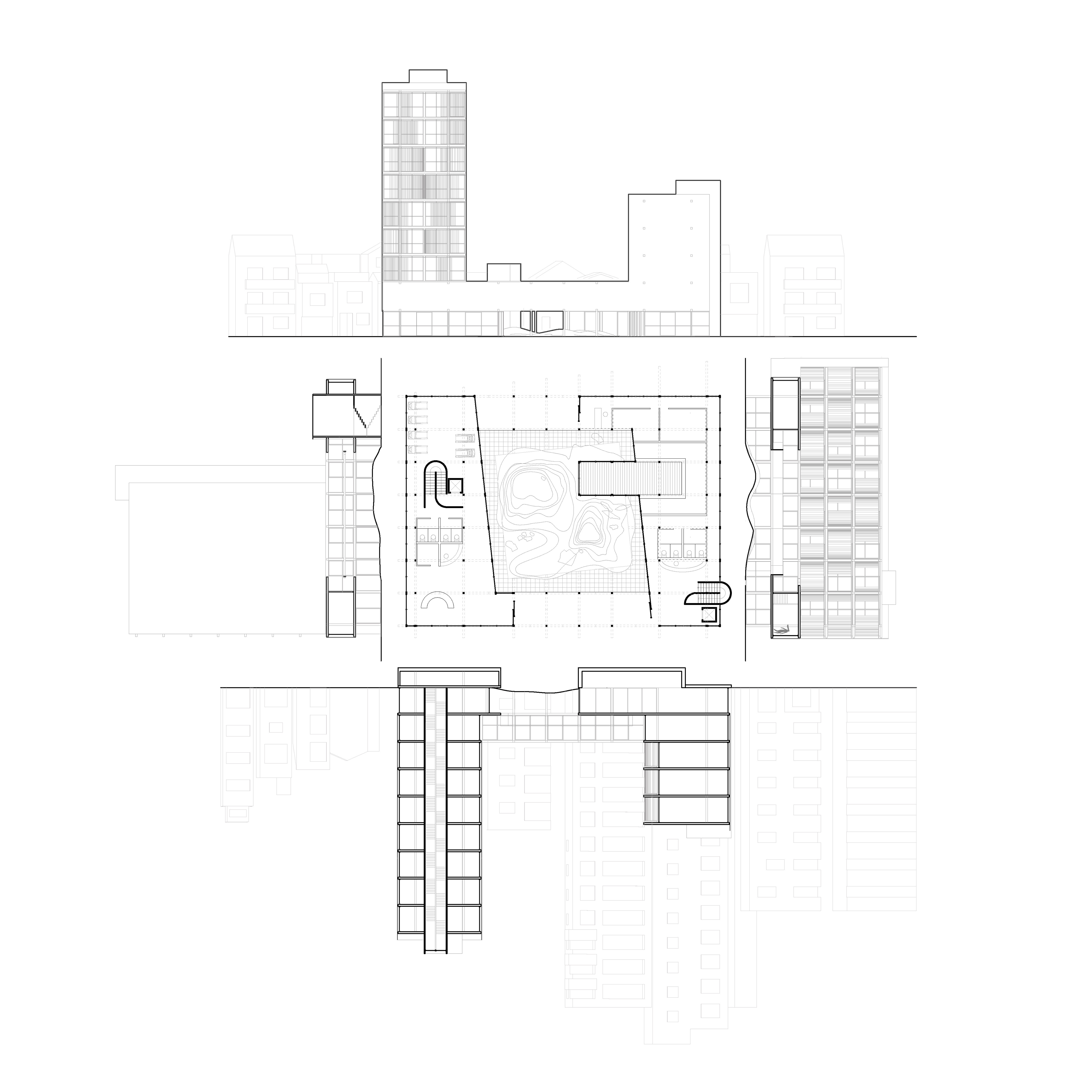 Questioning the current state of medicine, the Healing Hotel aims to bridge preventive and reactive medicine, by offering accessible spaces for physiotherapy, relaxation, and social interaction. The garden in the courtyard, with its exaggerated landscape, serves as a community hub, children’s playground, and a challenging terrain for patients who are working hard on regaining the strength of their bodies.