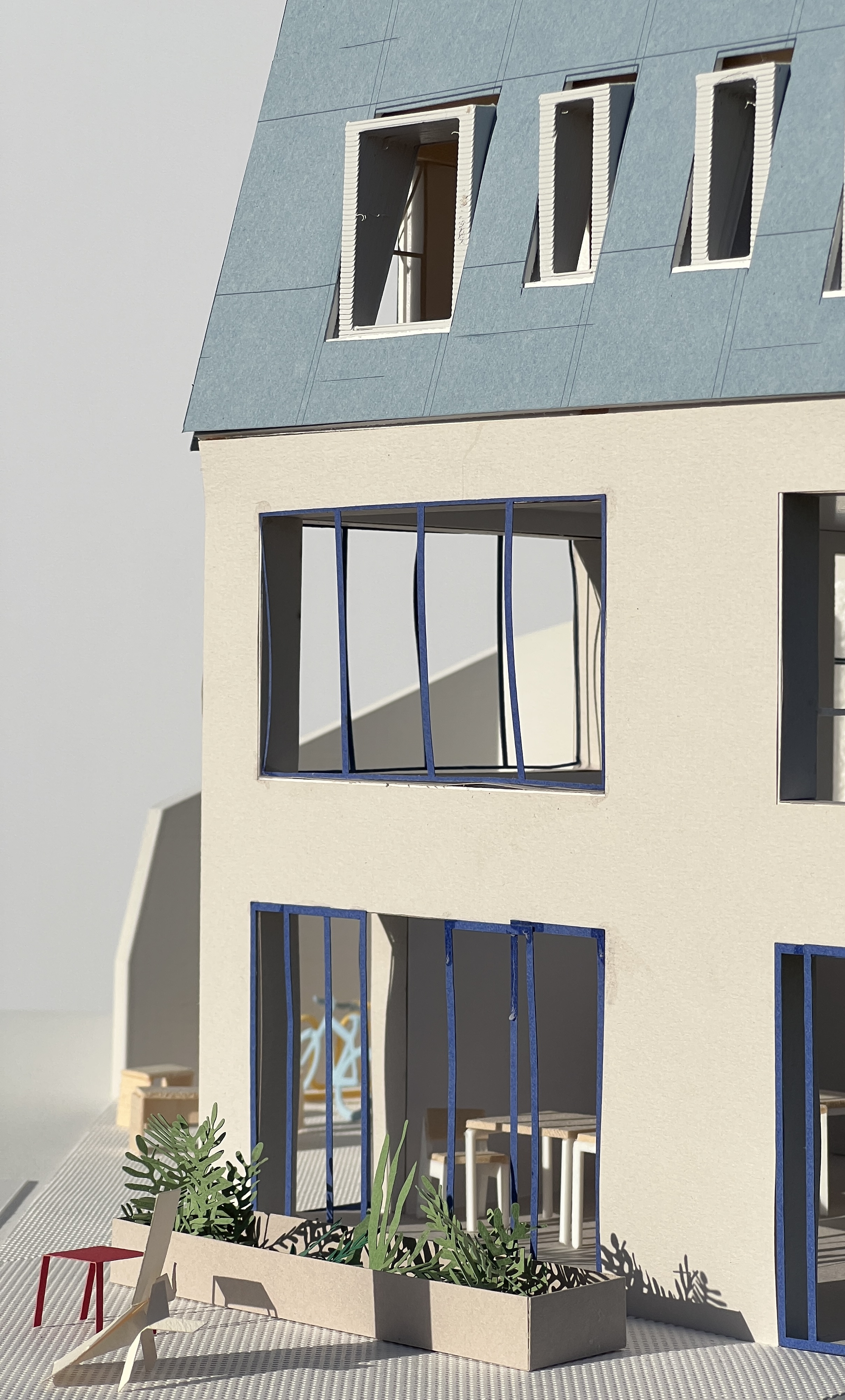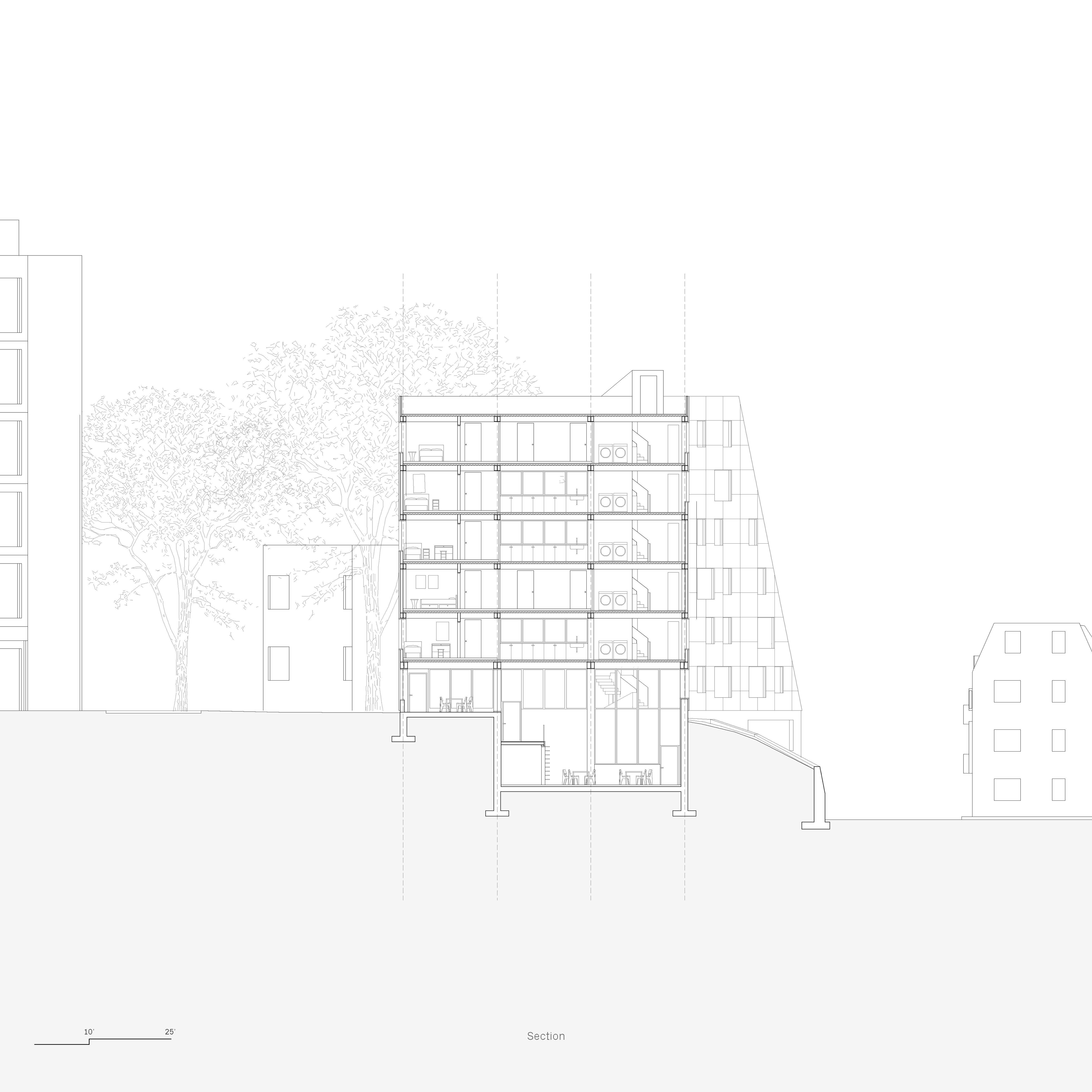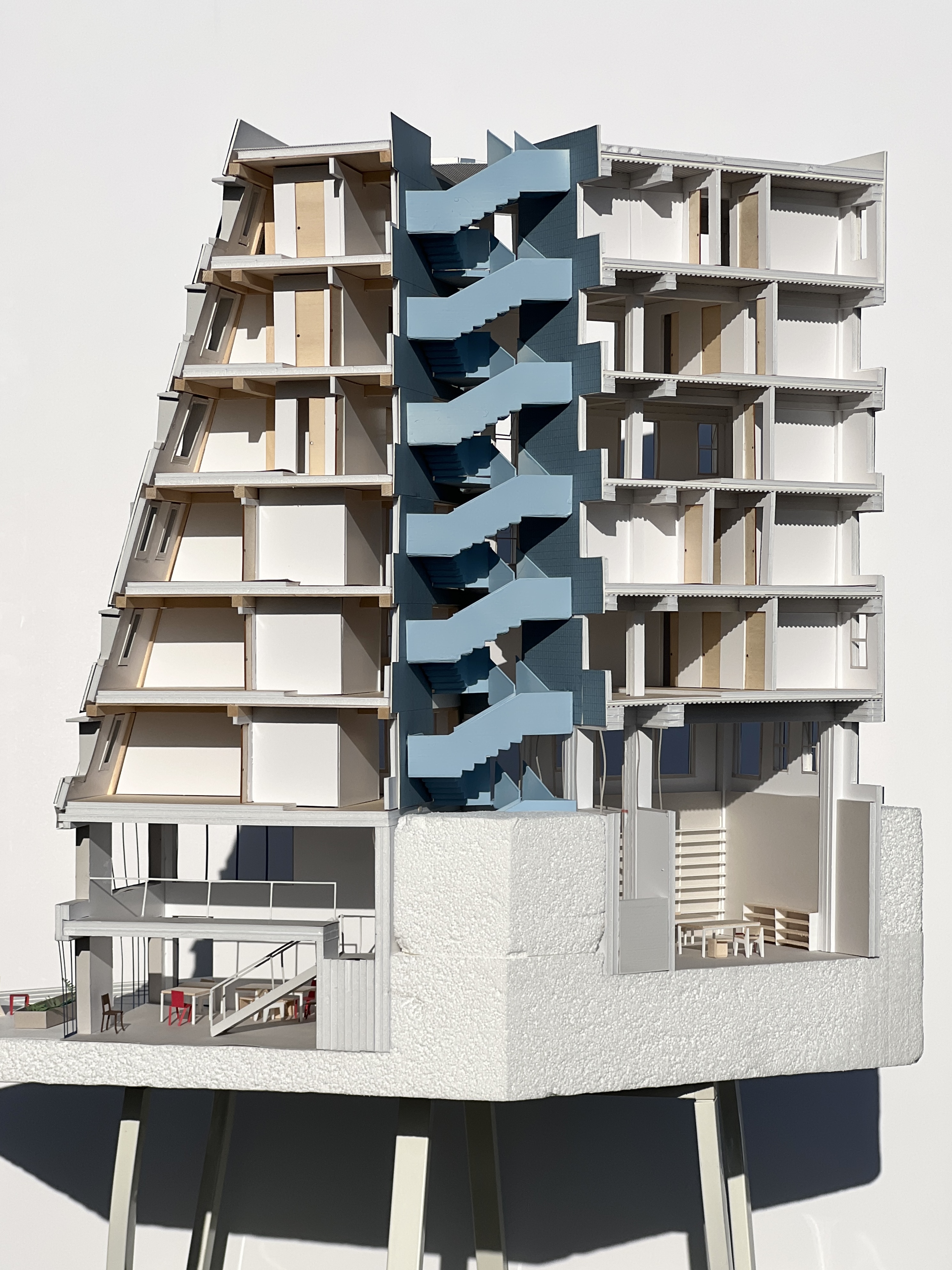 The postwar economic boom marked a significant shift in Japan’s cultural conception of urban housing, from a porous and often multigenerational spatial unit that combined living and workspaces under a single roof, to an autonomous site for the reproduction of labor power. Countering the almost exclusive focus on nuclear families in Tokyo’s contemporary housing market, Hinge House proposes a semi-mixed living arrangement between senior citizens and university students, exploring architectural methods to increase affordability and reduce social isolation in a neighborhood known for both its institutions of higher learning and presence of elderly care facilities. Compact units provide essentials for single-person households without the underused ‘luxuries’ of typical dwelling units, relocating large sitting areas, outdoor areas, laundry facilities, and fully stocked kitchens to generous shared spaces on each floor. The building’s massing splits into two volumes, the first of which houses senior citizens and serves as a tapered addition to an existing disused facility at the edge of the Tokyo University campus. The second volume, which houses students, connects to the first at its corner and is built over a new public stair that links Yanesen’s low-lying residential streets to the institution’s elevated campus. The two volumes meet at a triangular stair core that serves as both the building’s primary circulation route and an open, social interstice between the senior and student apartments—the project’s eponymous hinge.