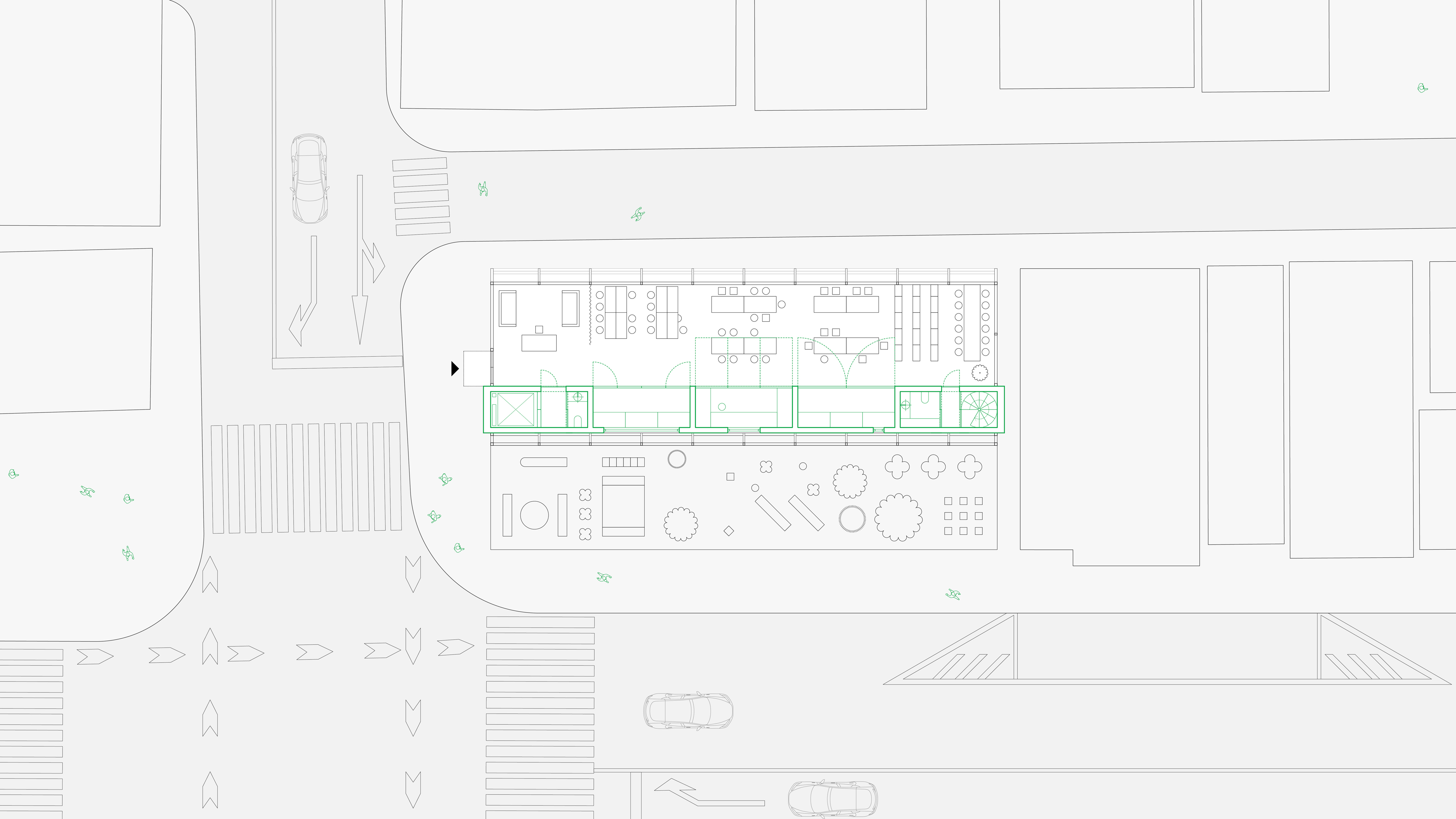 The building tilts towards the main street, supporting the street line at the top and, at the same time, creating an open public space at the bottom. It inclines differently towards the narrower secondary street, providing more light and air outside and inside the building. Some panels that form the boundary of the wall provide access to storage or recessed space, such as an alcove for art, a gallery, a kitchen, or a studio. Some panels are the function itself as they transform into furniture while open. Time will pass, structure will stay, and the shiny sheets of metal will be replaced.
