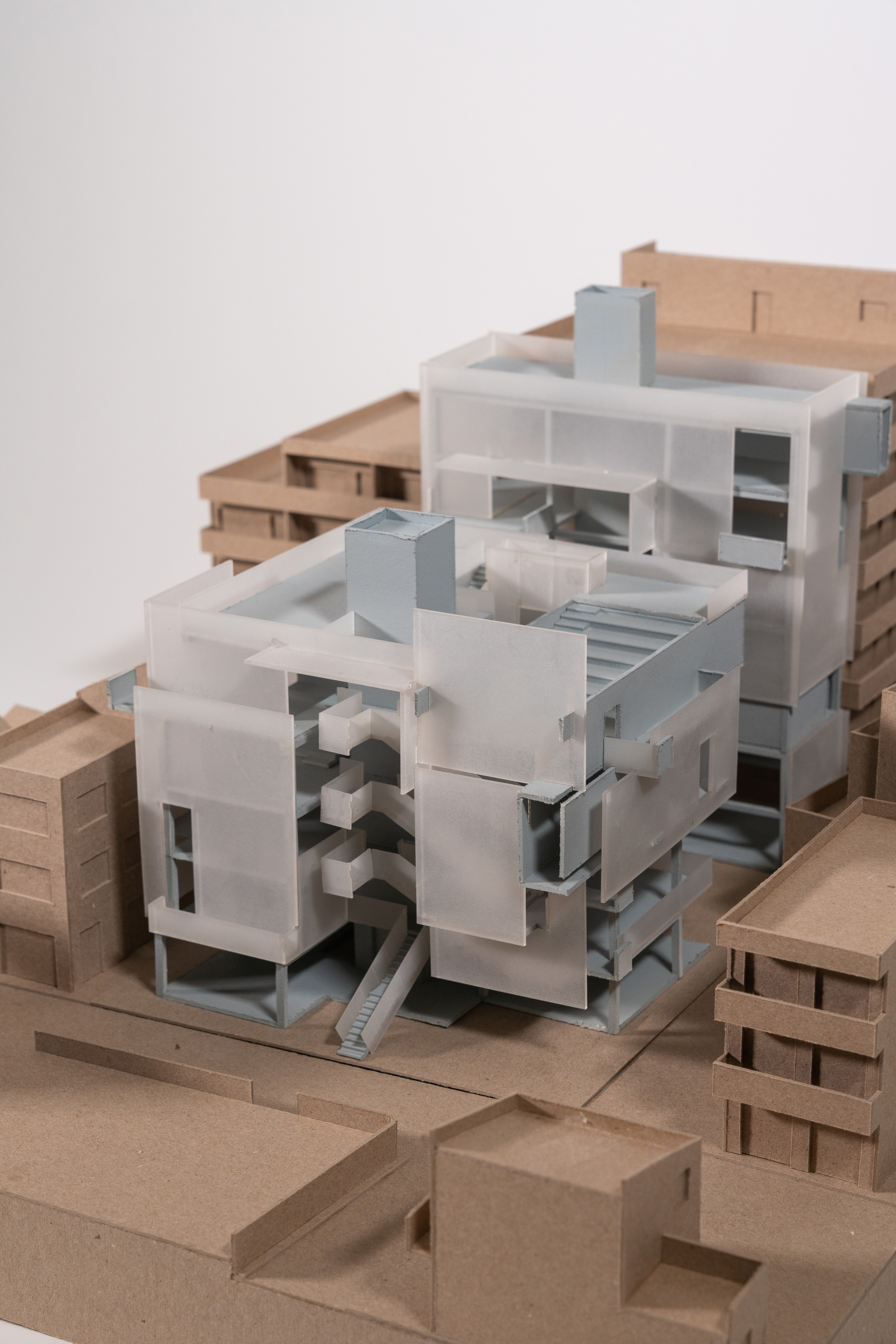 The 1:100 model showing shifting masses, planes and walls which create these “little spaces”