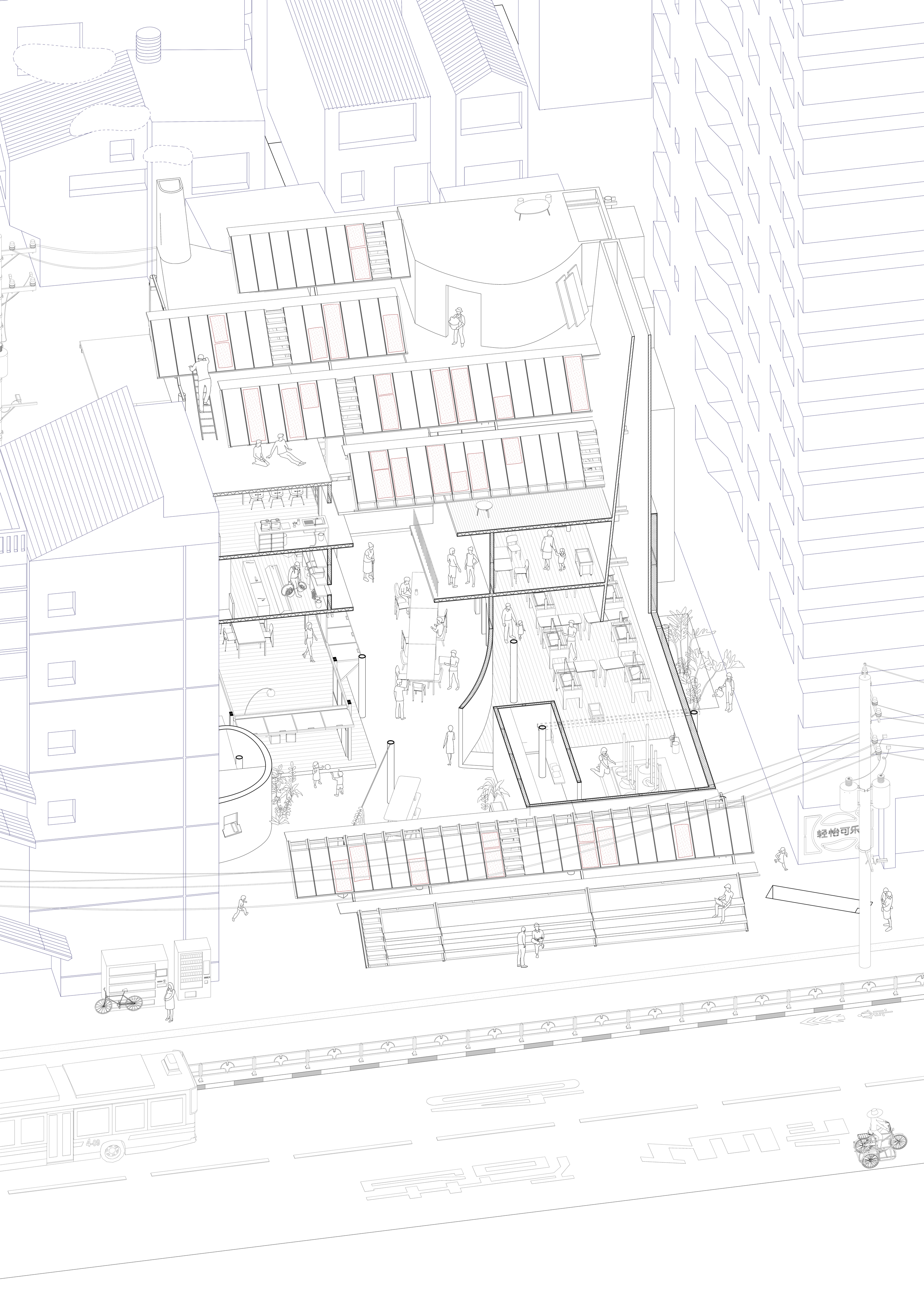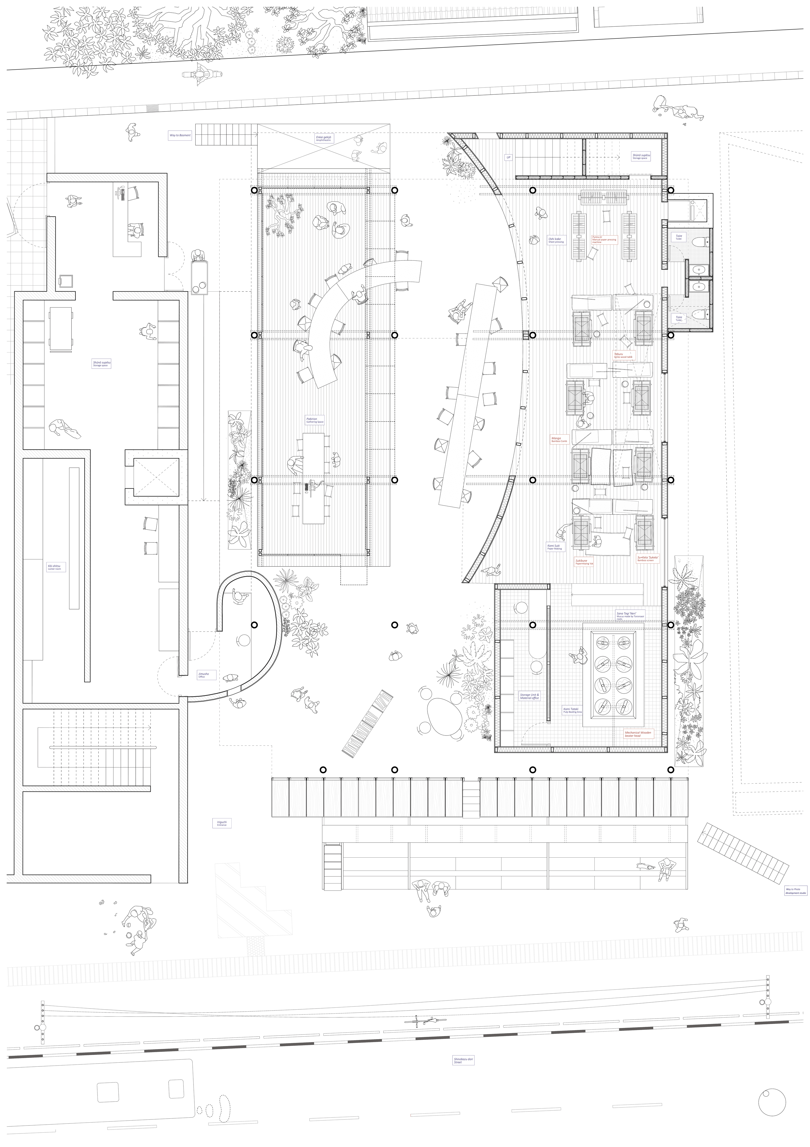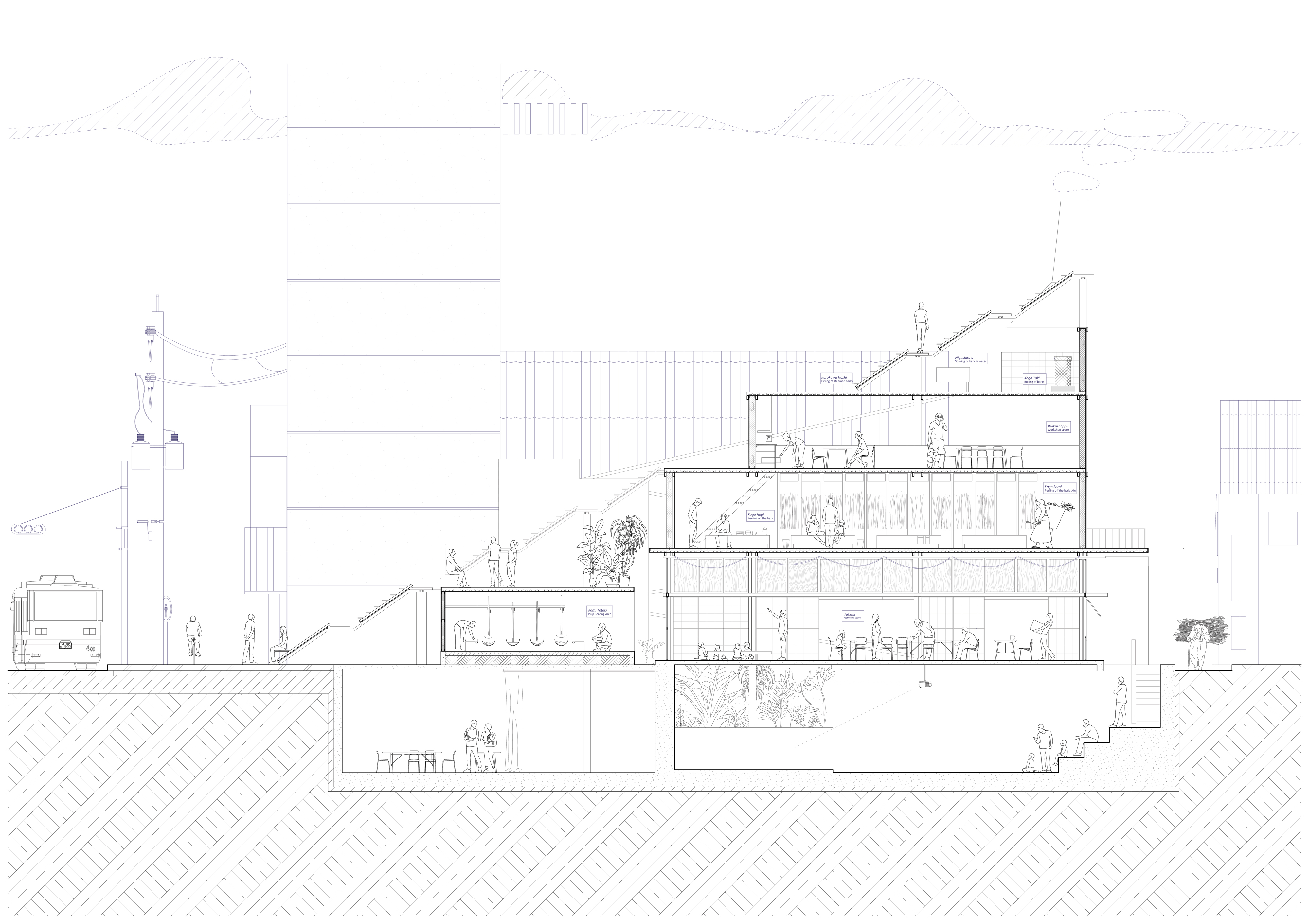 The oblique section reveals the intricately designed spaces that support the urban factory. Under the roof, the buildings can be read as two units divided by a narrow passage. The unit on the left is connected to the existing community center on the west and houses the majority of the papermaking processes, whereas the unit on the right houses the workshops and community spaces for visitors