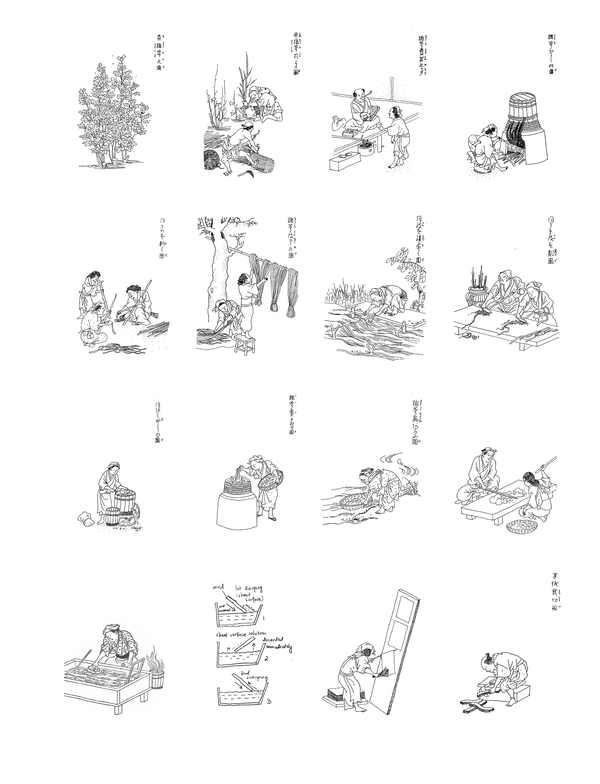 Illustration of the steps involved in the process of producing Washi, which eventually informs the design of the built form