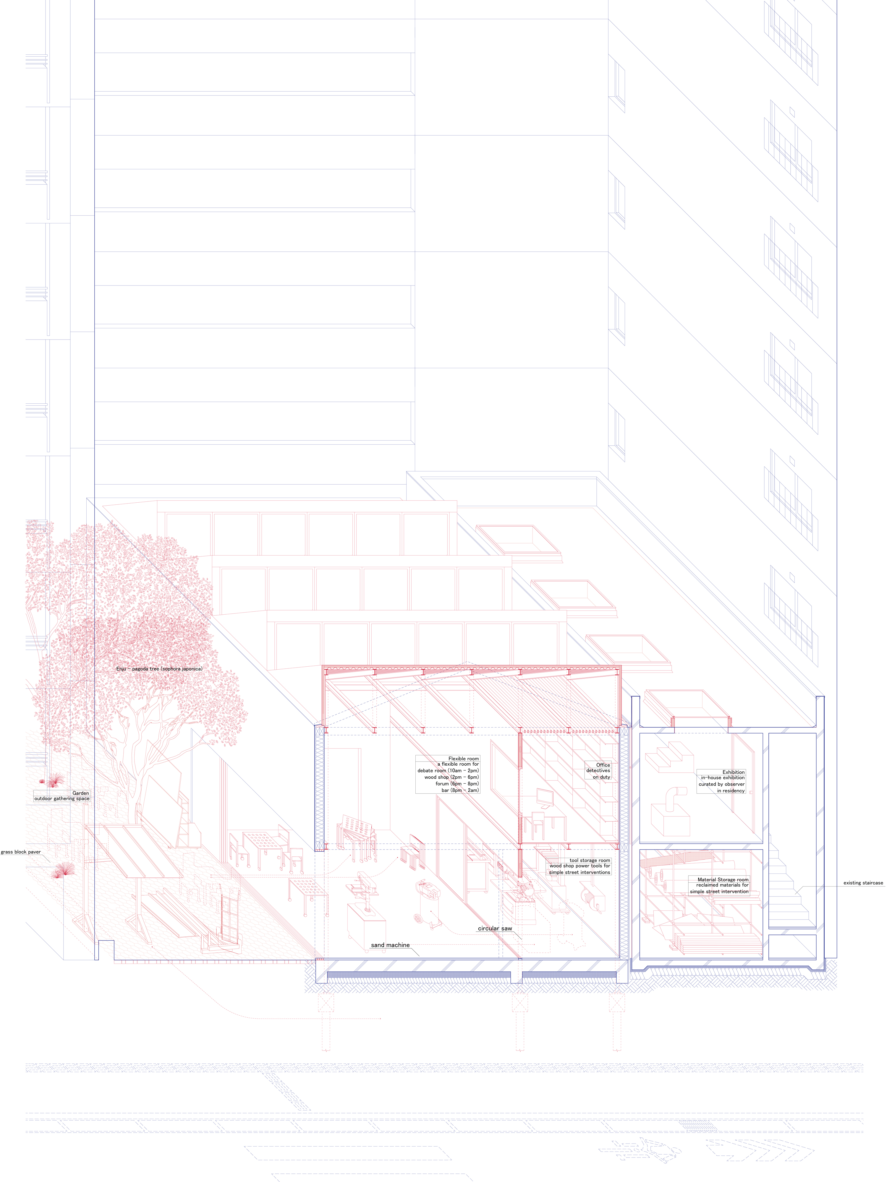 Architecturally, the project revitalizes two abandoned structures. These buildings are designed to be non-permanent, with open and purposeless spaces that support both the community’s and individuals’ interactions with the city.