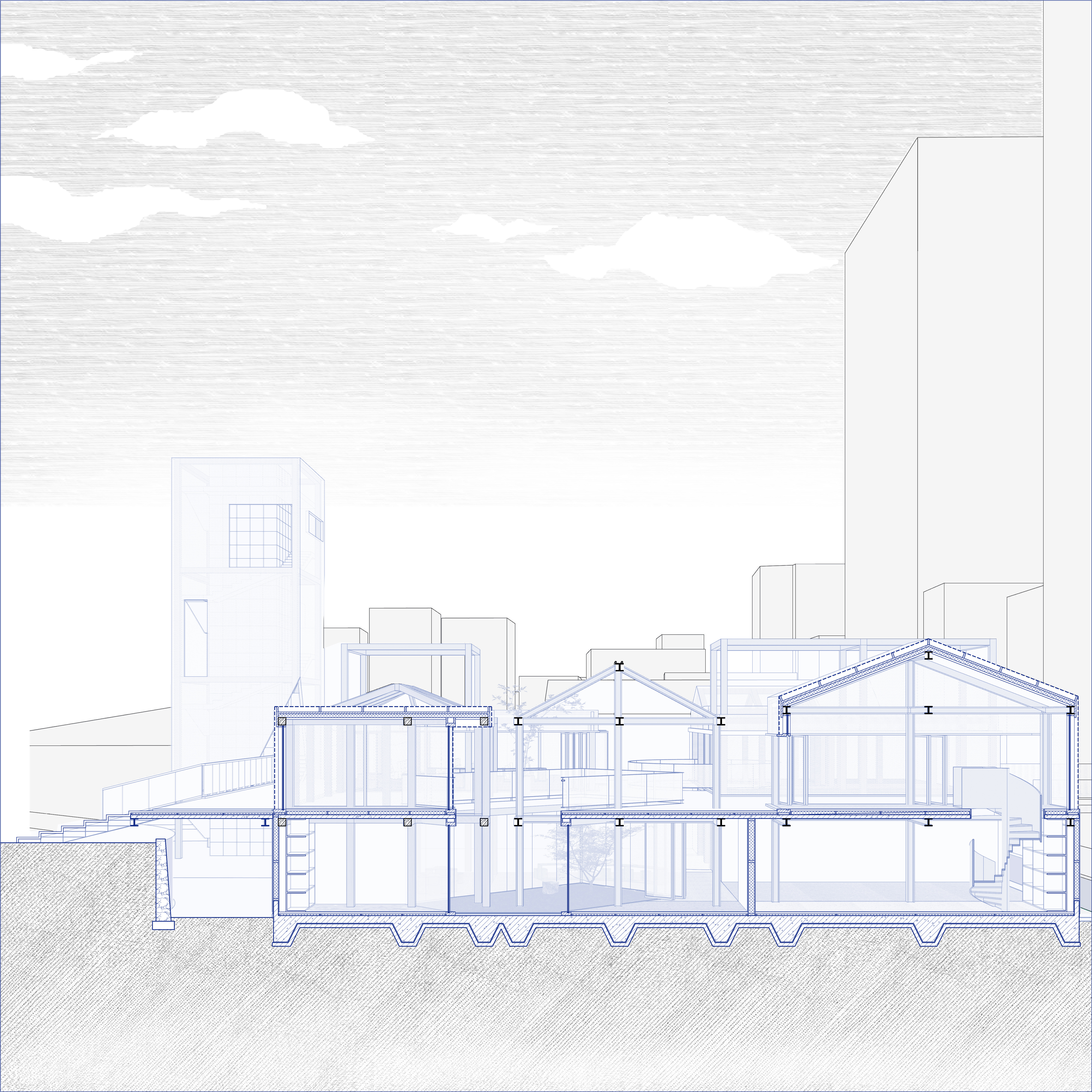 The project contains three different urban typologies, the high-rise typical Tokyo apartment group, the low-height house cluster in the middle, and the temples with graveyards in the back. The mixture of different typologies also provides aspirations and opportunities to establish a hybrid and diverse space