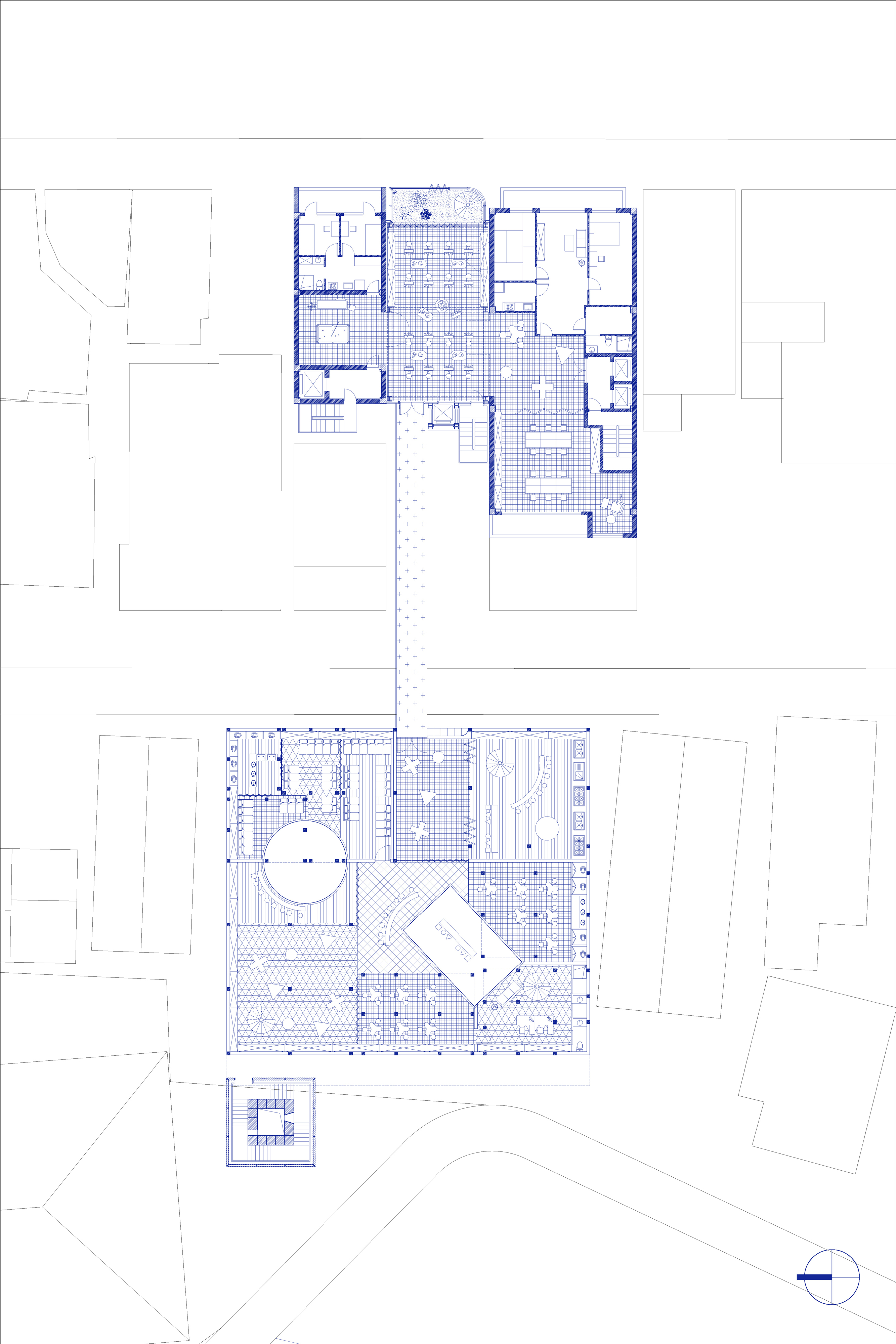 The formal language of this part is like a plate or a podium holding up a series of light and transparent small volumes, helping create more opportunities for outdoor activities