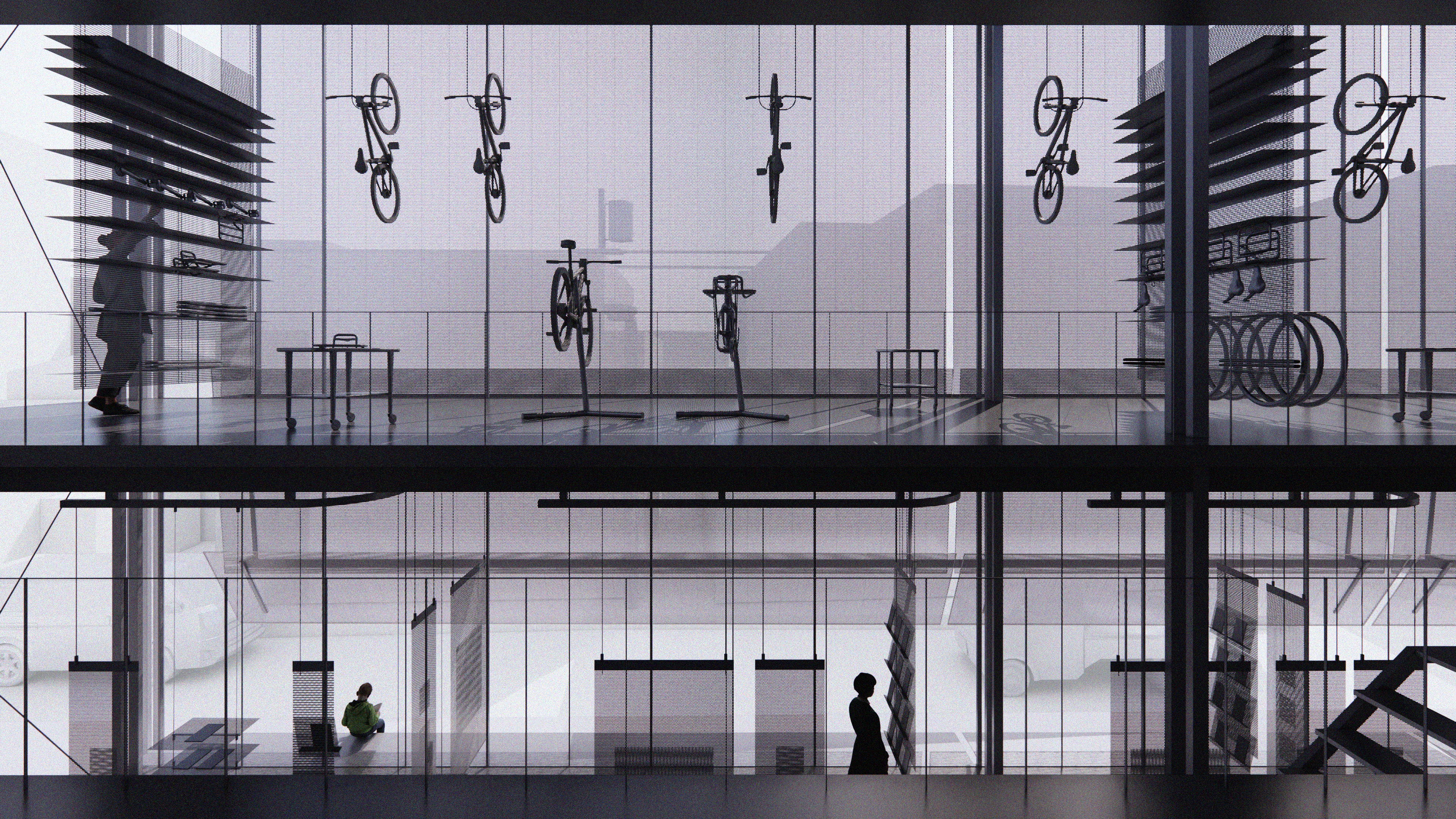 An interior rendering of the split-level design reveals visual connections between the bike refurbishment space and the adjacent gallery.
