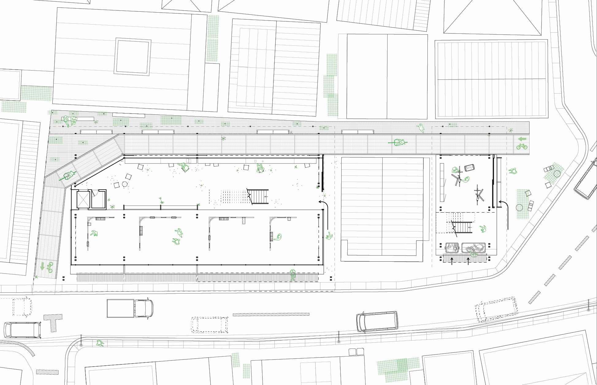 Due to the busy activity in front of the site, this proposal introduces a secondary street that caters to slower pedestrian and bike traffic. This alternative passage runs parallel to the main street, offering a calmer pathway for cyclists and pedestrians to meander at a slower pace.