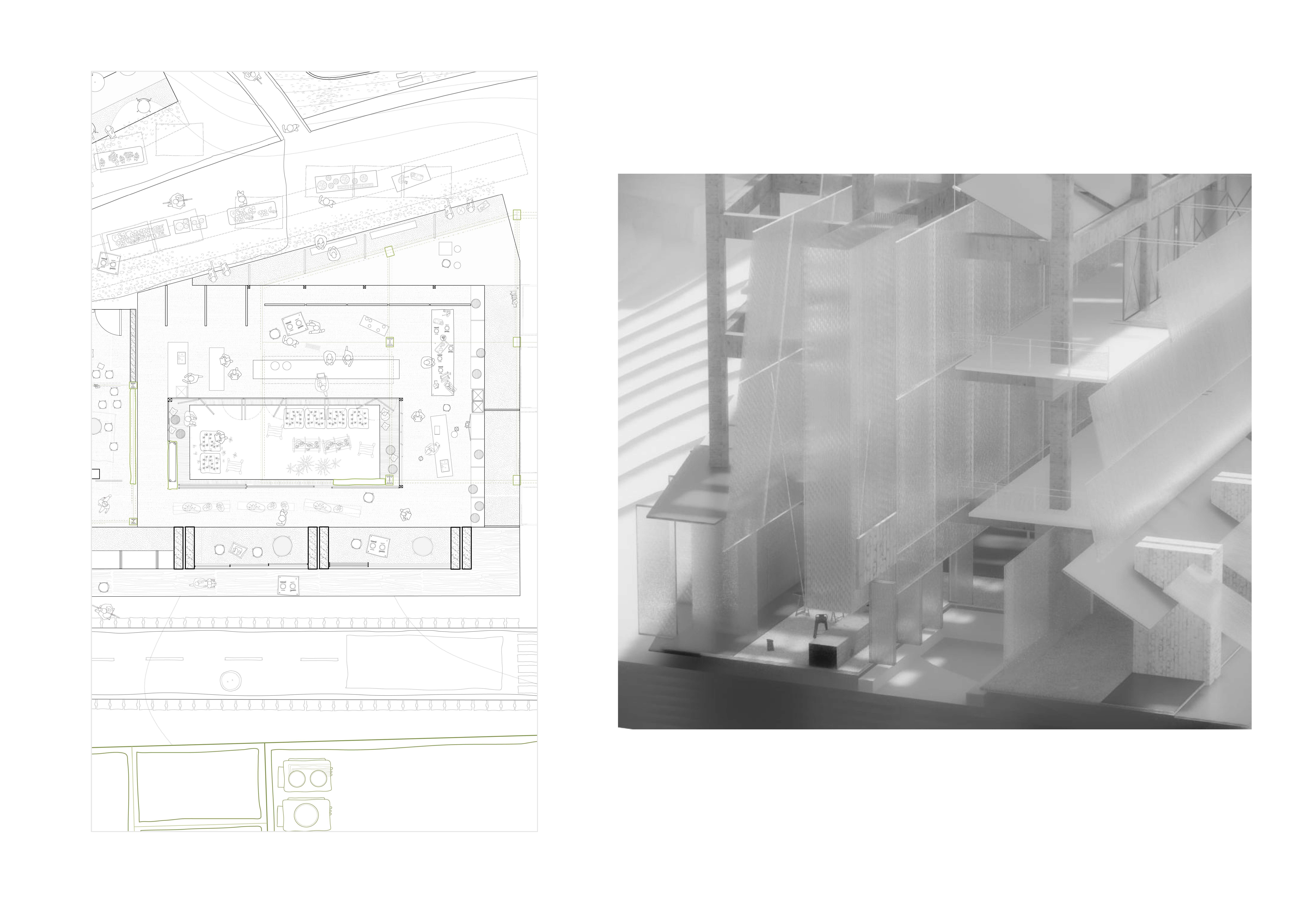 Program: Kitchen, communal dining hall, food market, retail alley, balcony transformation