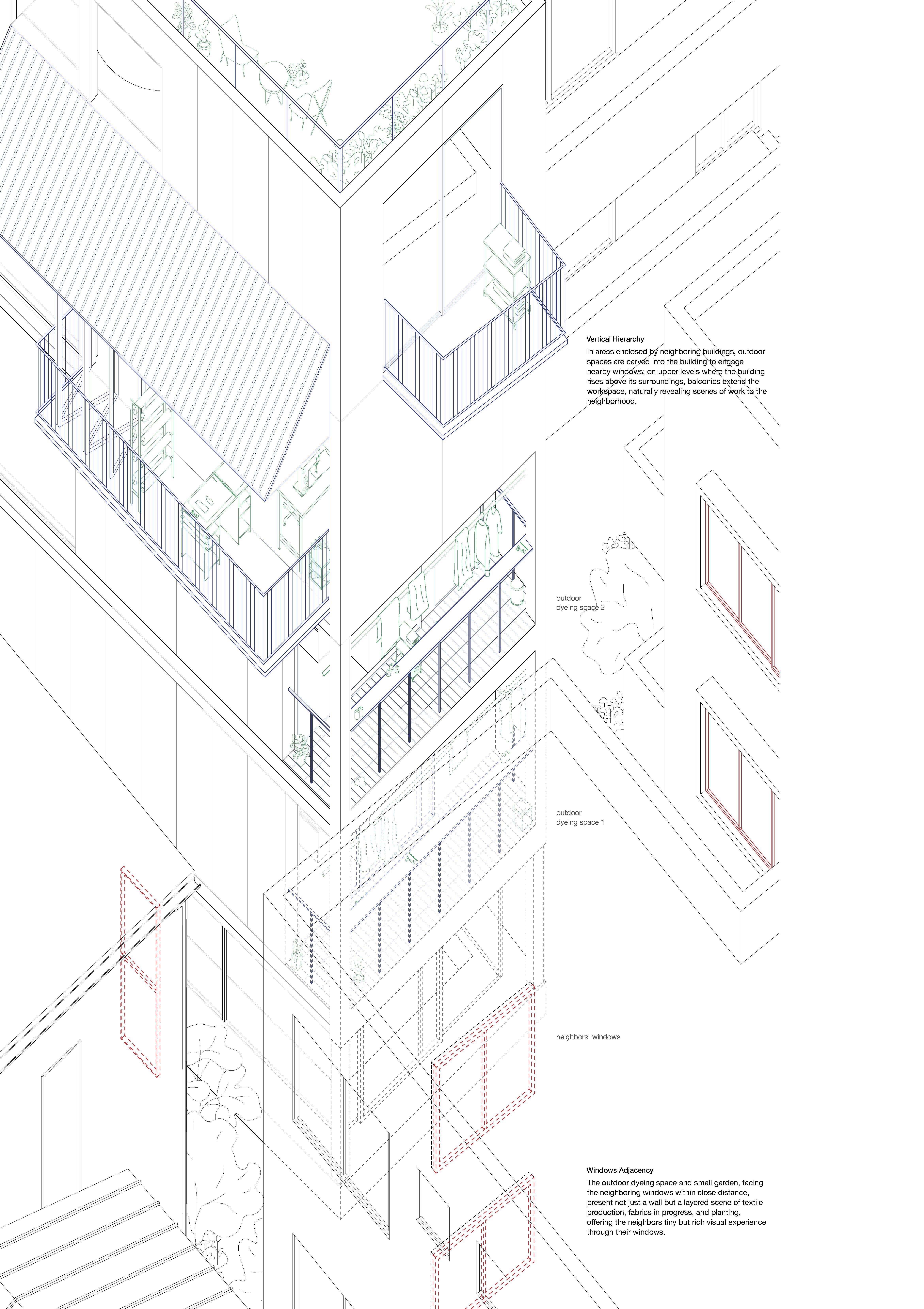 “Live Big in a Small House” proposes a dwelling prototype that brings living and working together on a narrow cul-de-sac site in Shimokitazawa, Tokyo. Responding to the neighborhood’s loss of local texture through gentrification, the project looks to restore the close ties between daily life and labor that once shaped the area. The building sits on a 6-by-15-meter lot and includes four house-workshop units and shared programs like a laundromat and staircase garden. Ordinary architectural elements such as staircases, balconies, doors, and built-in furniture are used to create subtle shifts between inside and outside, living and working. Each unit follows a U-shaped circulation to expand the experience of space and allow functions to overlap. A dyeing area placed across from a neighbor’s window, or a desk extending onto a balcony, are small moments that open the project to its surroundings. Rather than relying on grand public gestures, the project explores how soft and small thresholds can foster conviviality in dense urban neighborhoods.