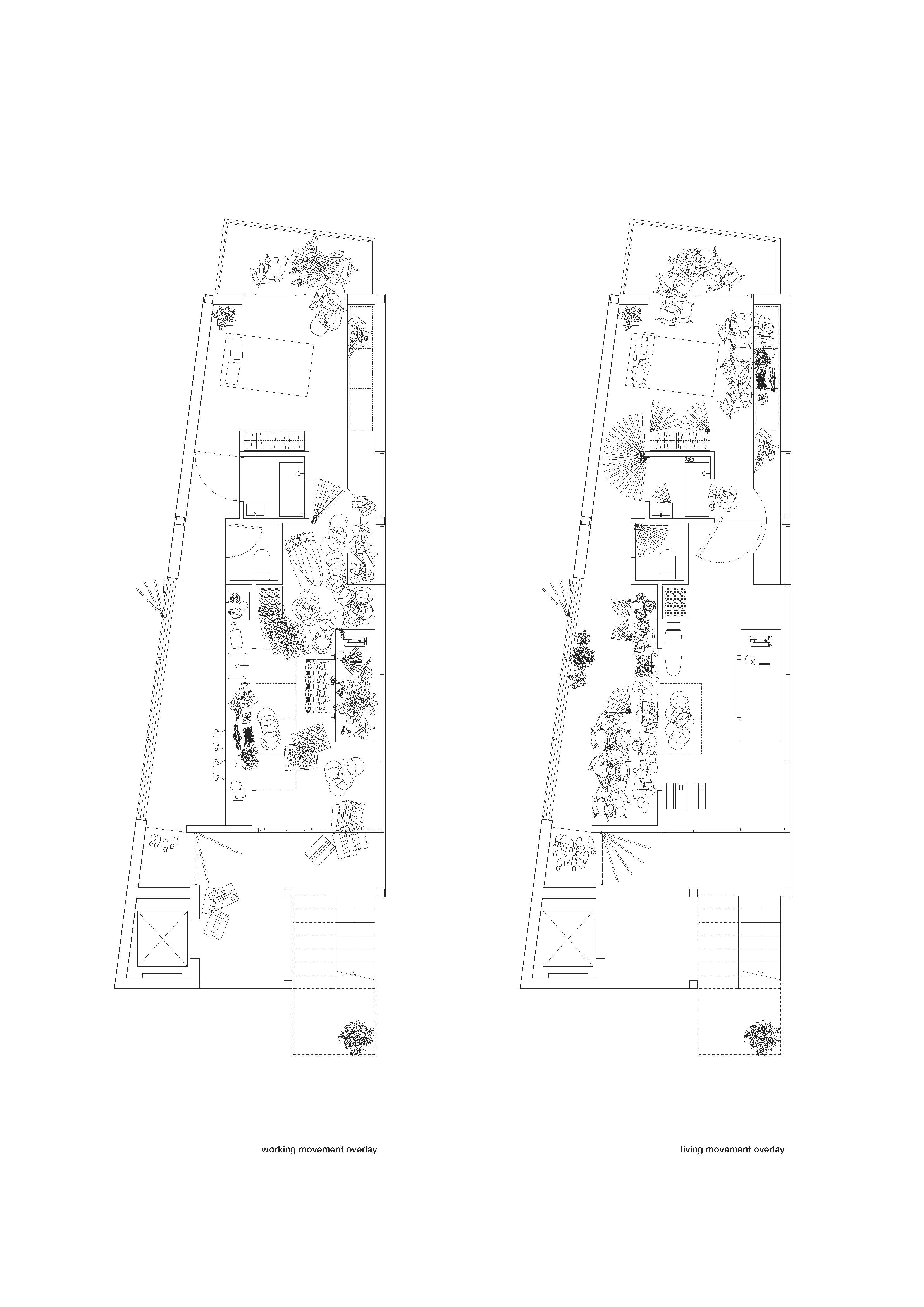 An overlay diagram demonstrates how movement between living and working overlaps, softening the boundary between house and workshop.