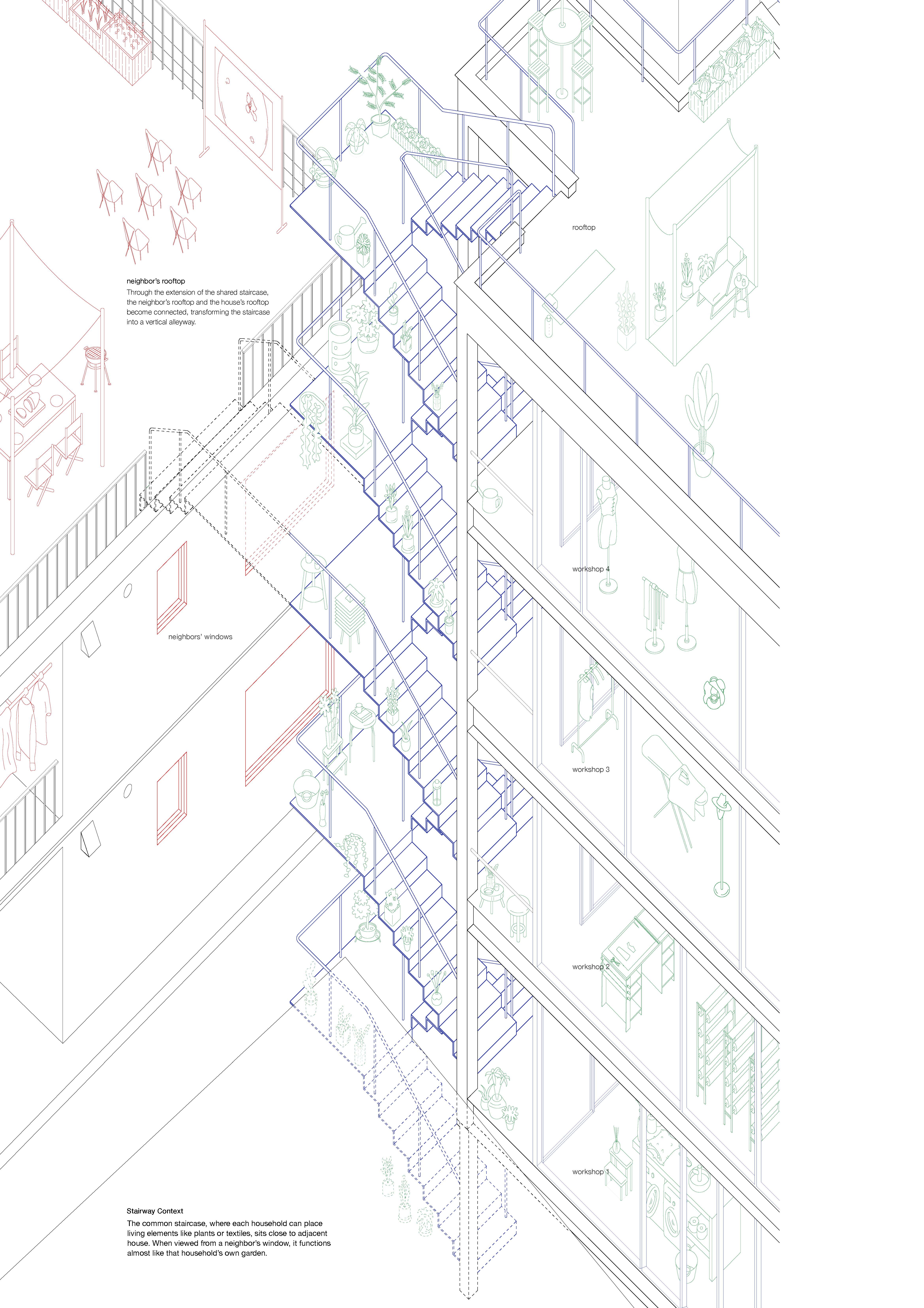 A context drawing of the communal staircase shows how each household can place everyday living elements along the stair, which sits close to the neighboring house and functions almost like a shared garden.