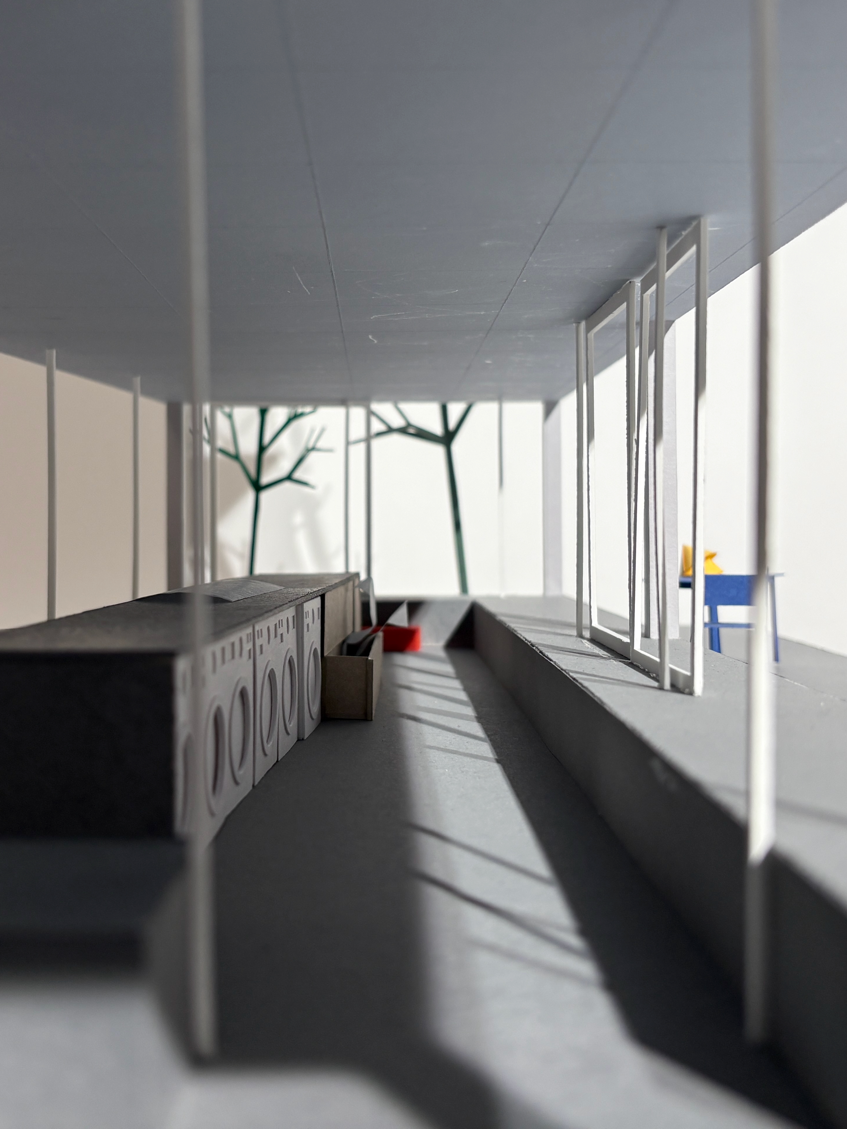 On the ground floor, concrete footings that support the steel frame rise 450 millimeters to form benches; though technically indoors, large sliding doors transform the space into a semi-outdoor zone that combines landscape, laundromat, and flexible use for clothing display.