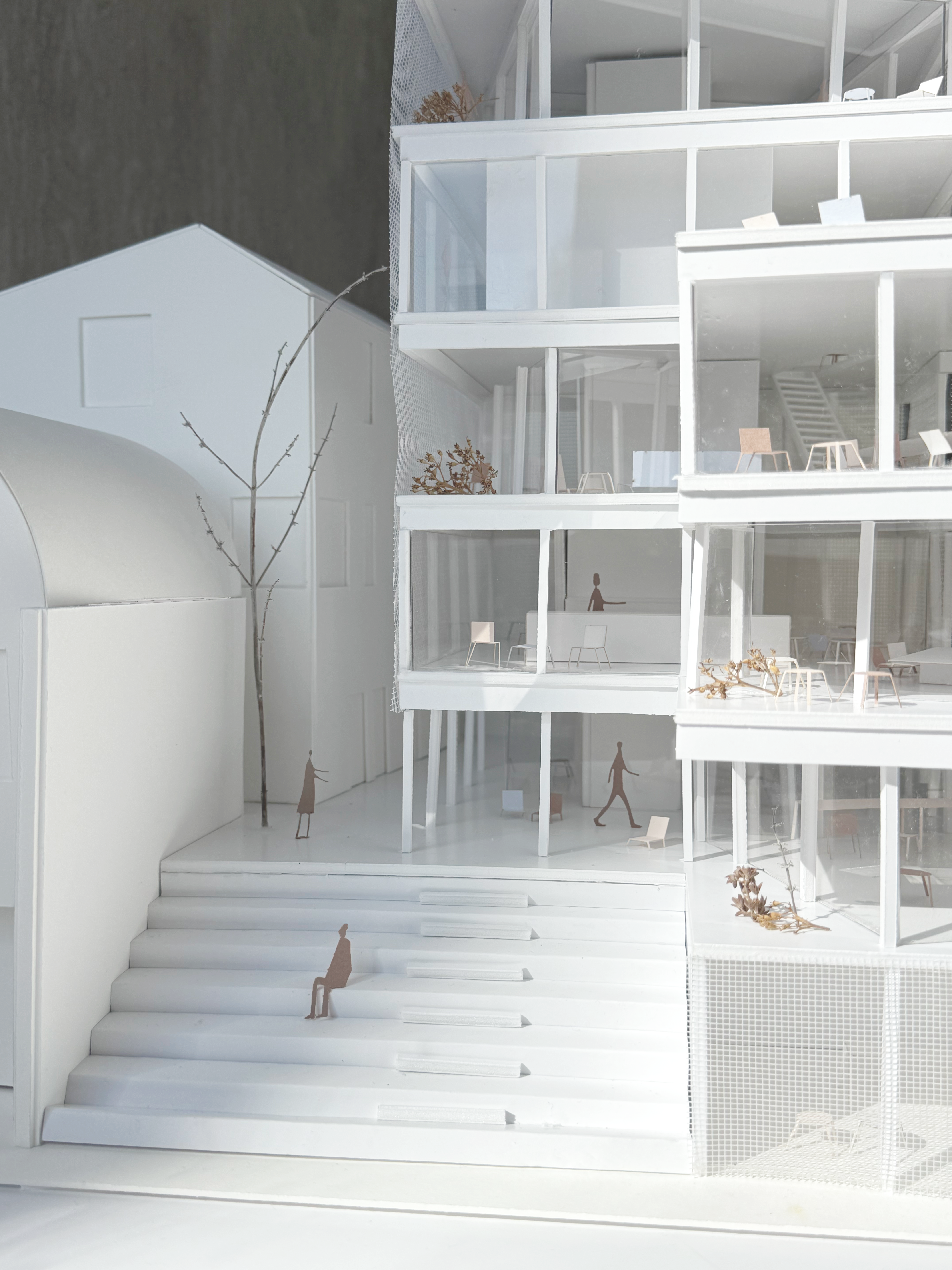 “New Patterns of Inhabiting: A Domestic Public Building” explores how architecture can respond to the shifting patterns of living in contemporary Tokyo, where over half of households now consist of a single person. As people increasingly live alone in extremely compact apartments, often with limited access to light, green space, or room for basic domestic activities, feelings of loneliness and disconnection have become more common. This project proposes a building that functions as an extension of the home—open from morning to night for both collective and individual use. It offers spaces that support daily life beyond the constraints of small private dwellings: a café, communal kitchen, shared living room-workspace, onsen, tatami room, and rooftop terrace. Positioned between two streets, the building creates a public passage and a series of in-between spaces—balconies, mesh-screened thresholds, and planted terraces—that invite informal encounters and offer moments of quiet retreat. It aims to support fluid movement between solitude and sociability, and foster new forms of coexistence.