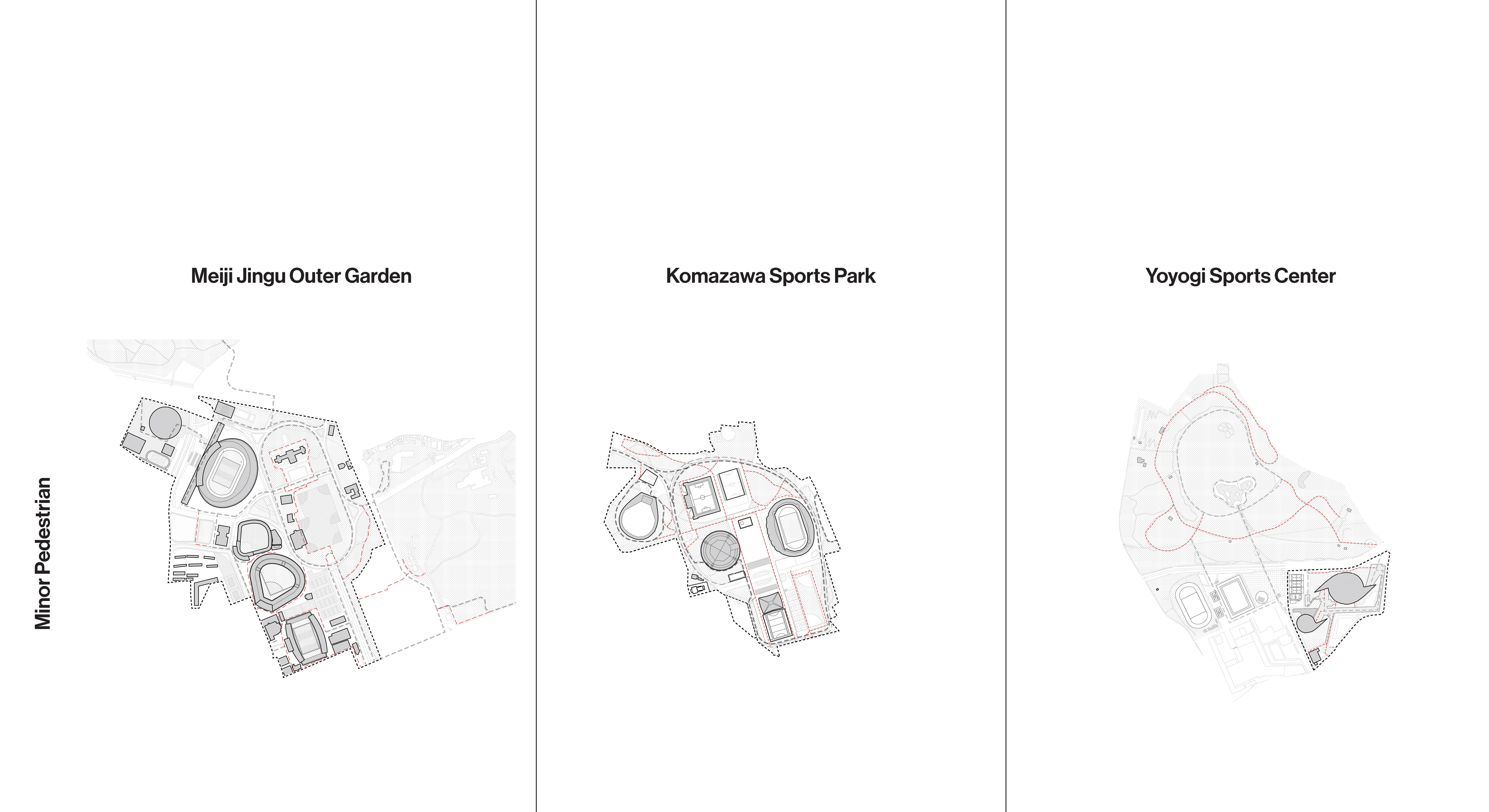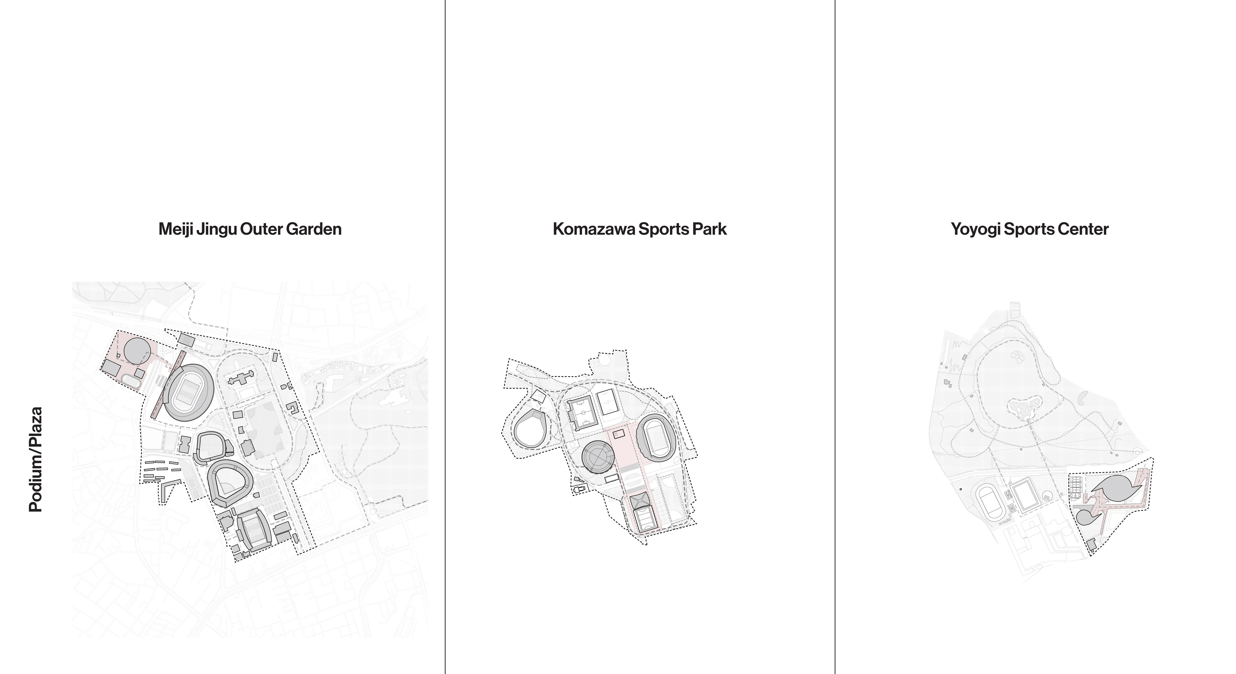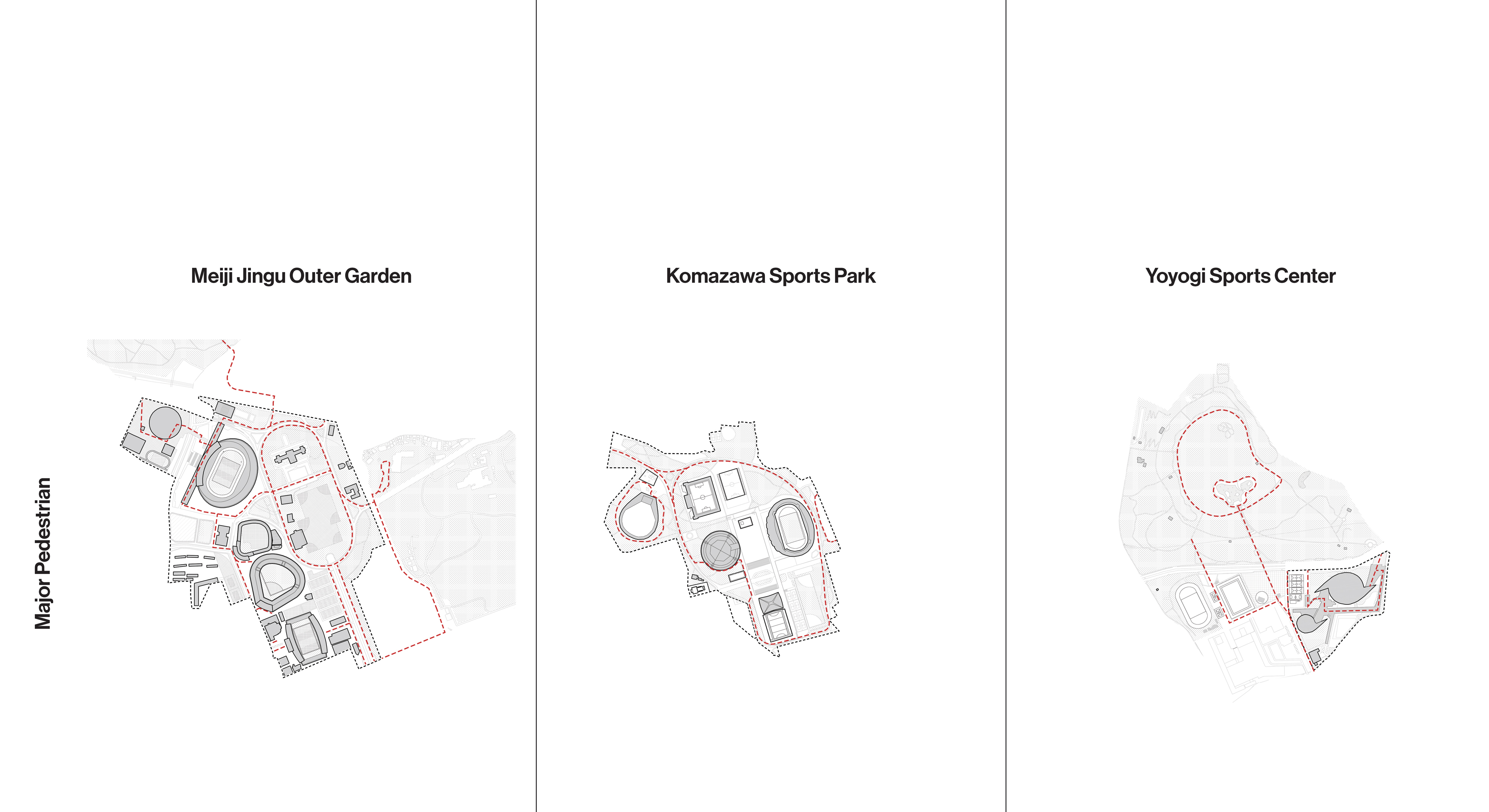 Each of the major 1964 Olympic sites has developed differently in intervening years. Each venue at Meiji Jingu Gaien is accessed, owned, and operated separately, which detracts from the coherence of the area as an athletic and culture campus. The Yoyogi 1st and 2nd Gymnasiums are operated by a single entity and flanked by public institutions. They are cut off from Yoyogi Park by a major road bridged in one location by a landscape promenade. The Komazawa Olympic Park, which is also administered as one unit, is connected to adjacent neighborhoods by a porous pedestrian network.
