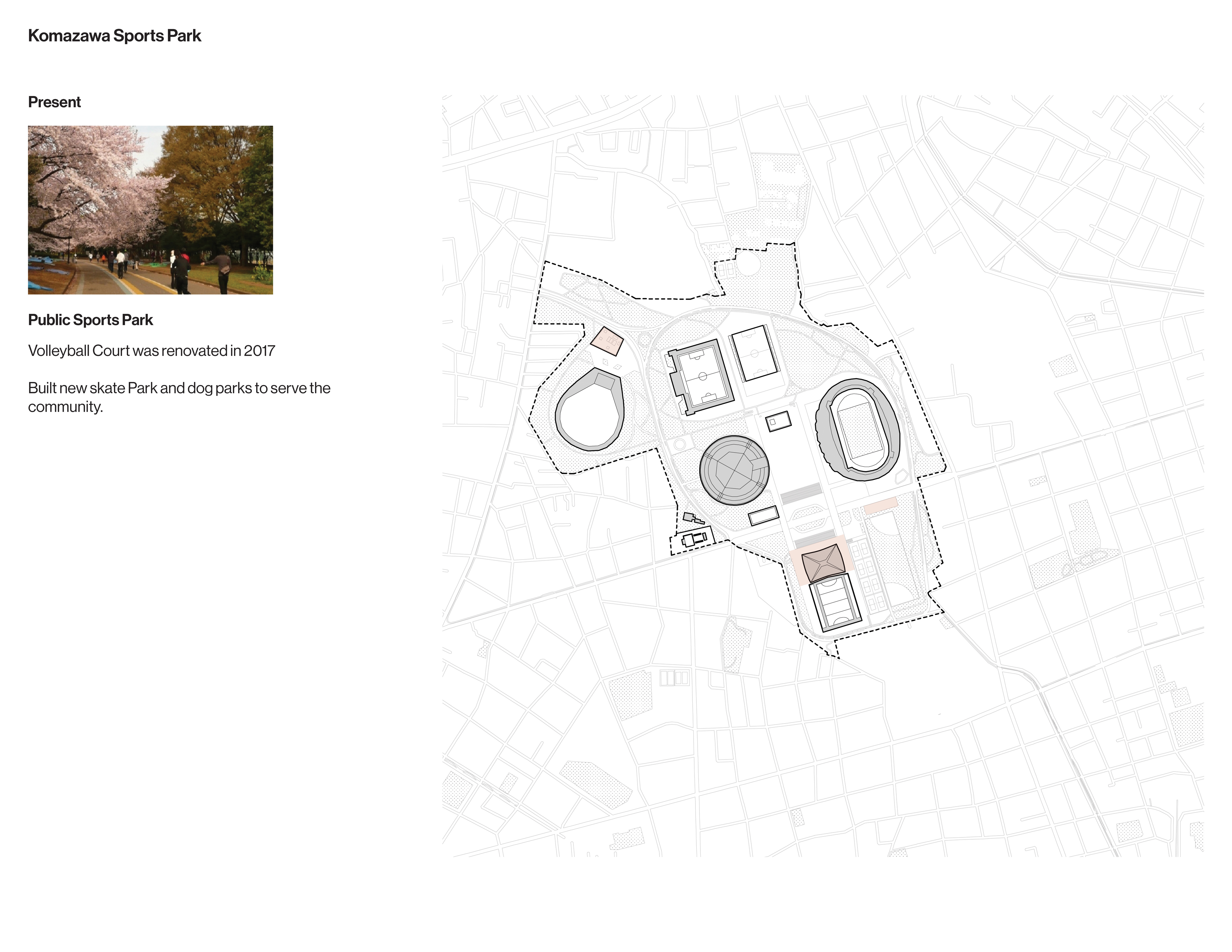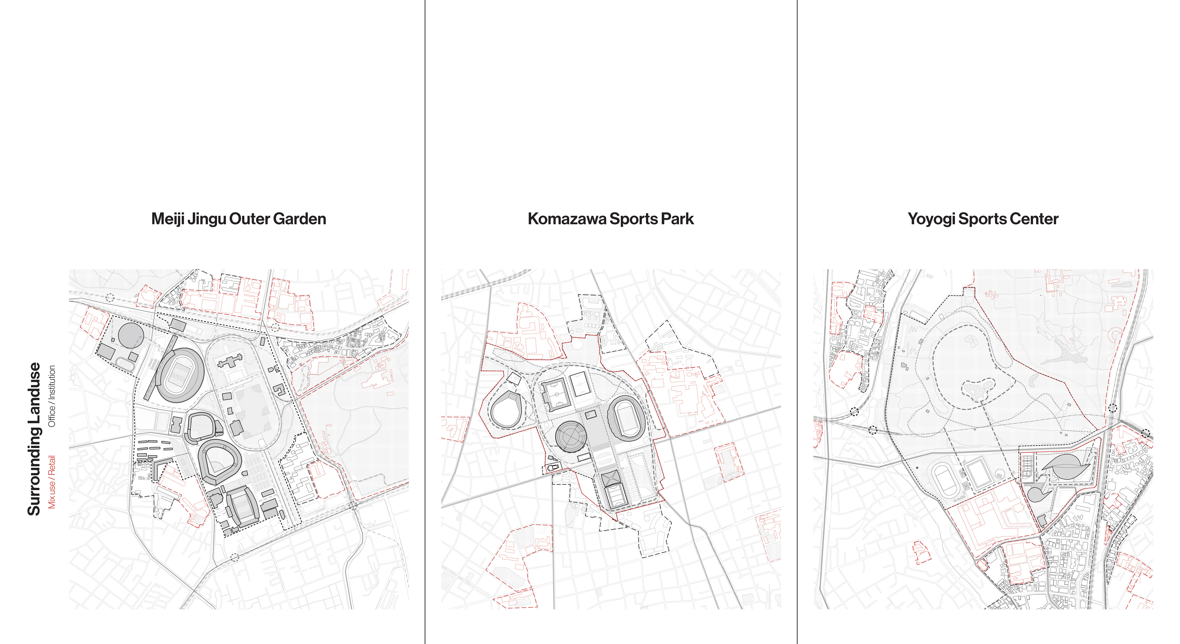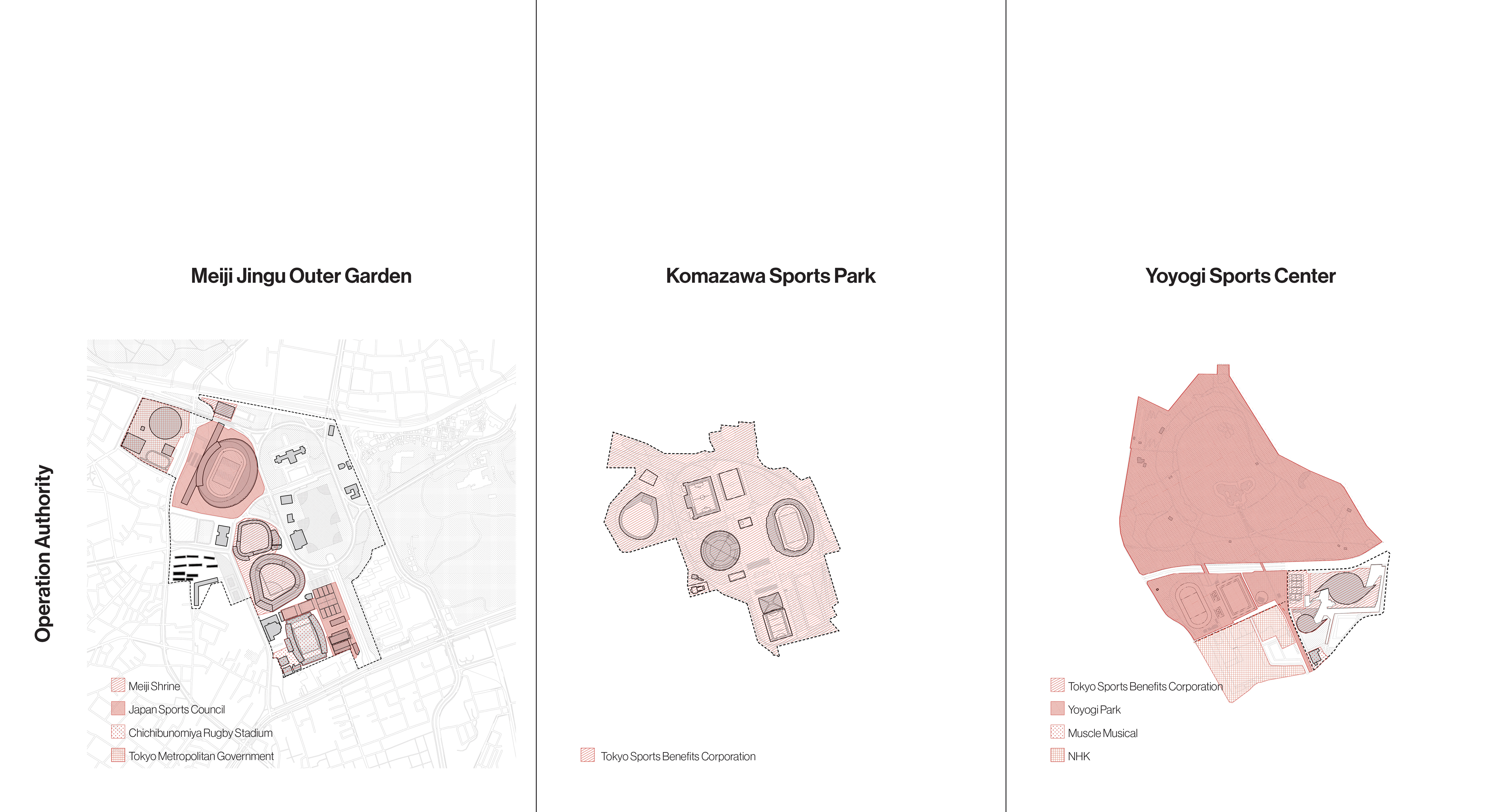 Each of the major 1964 Olympic sites has developed differently in intervening years. Each venue at Meiji Jingu Gaien is accessed, owned, and operated separately, which detracts from the coherence of the area as an athletic and culture campus. The Yoyogi 1st and 2nd Gymnasiums are operated by a single entity and flanked by public institutions. They are cut off from Yoyogi Park by a major road bridged in one location by a landscape promenade. The Komazawa Olympic Park, which is also administered as one unit, is connected to adjacent neighborhoods by a porous pedestrian network.