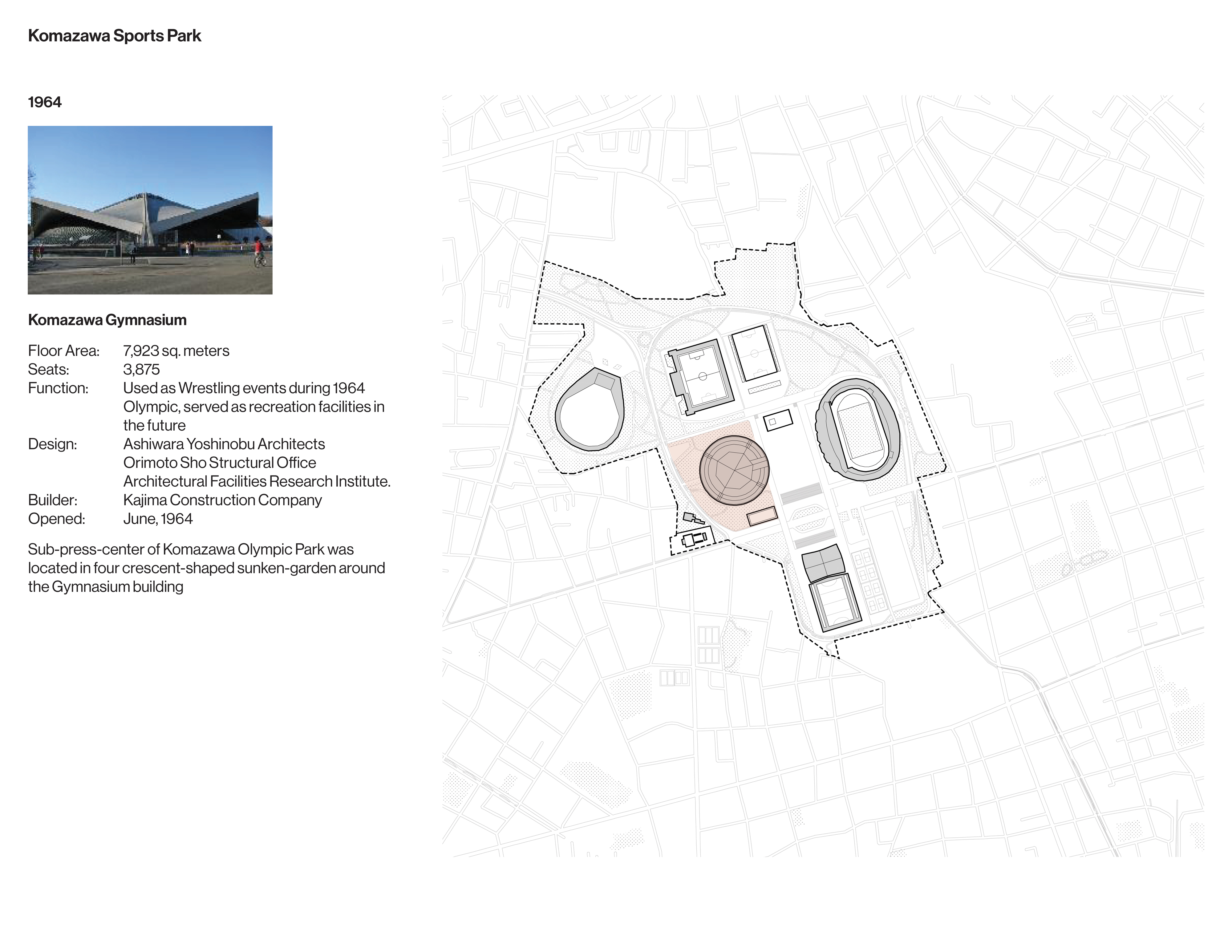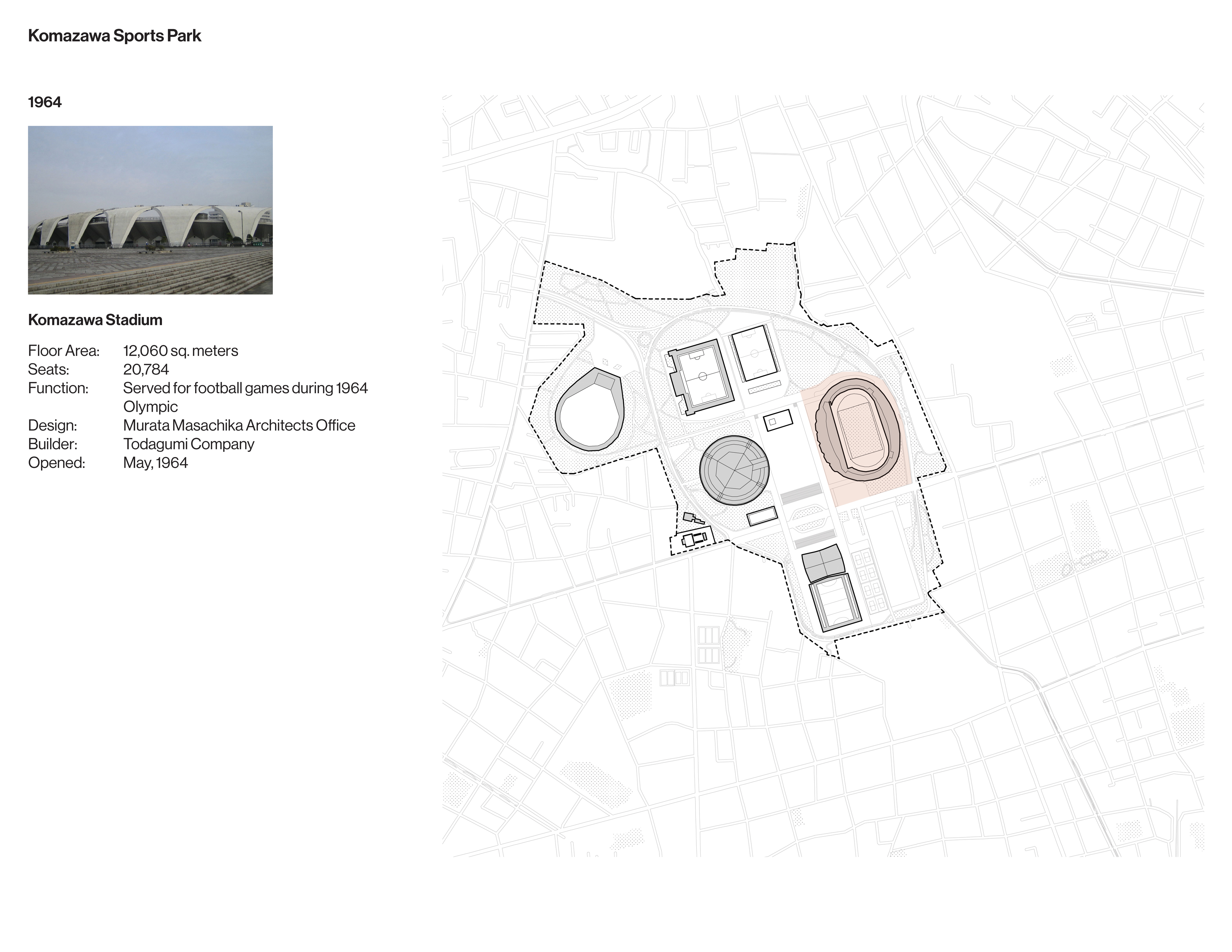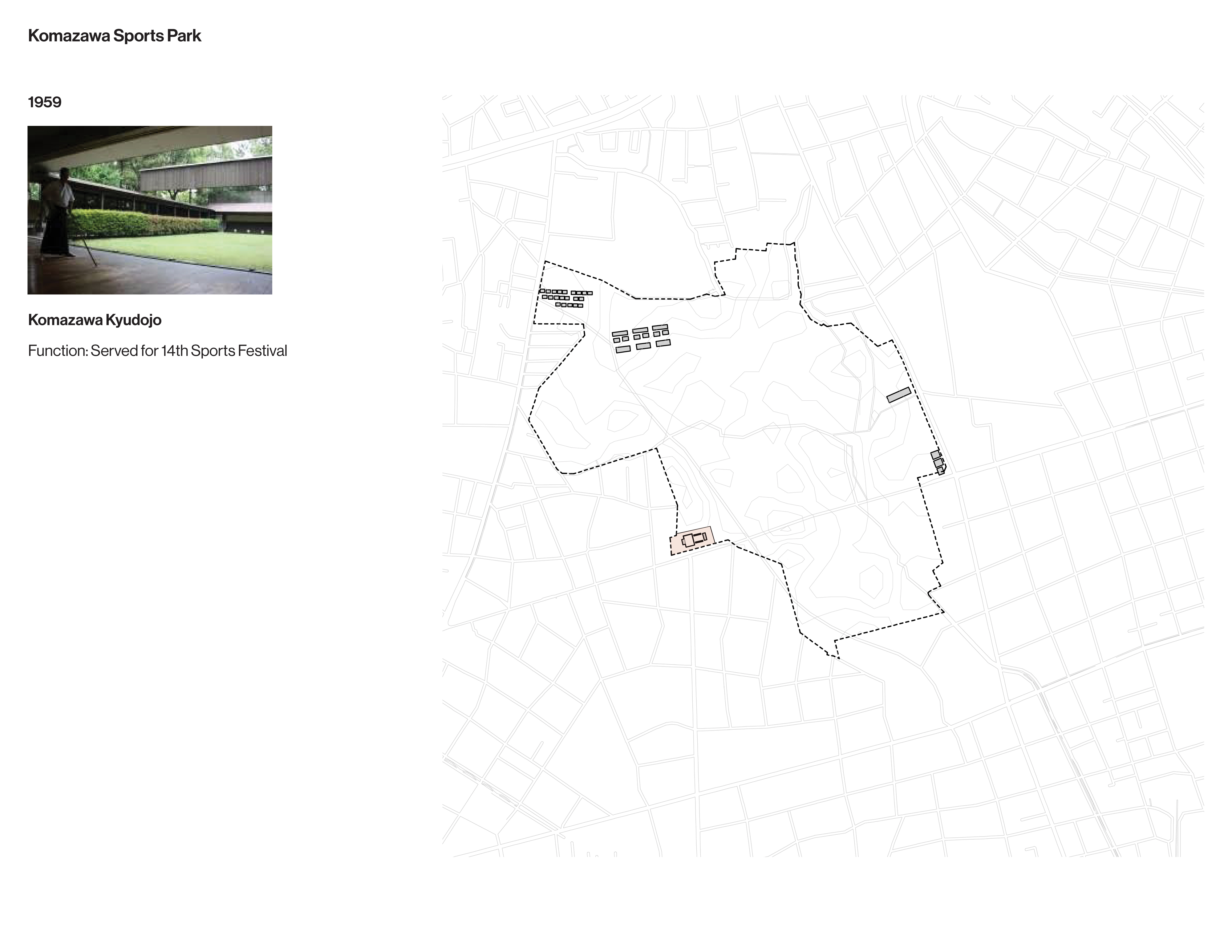 Once an exclusive golf club, the site of the Komazawa Olympic Park was identified as a venue for the 1940 Olympics before its cancellation. When the site was repurposed for the 1964 Games, a team led by University of Tokyo professor Eika Takayama devised a new master plan. Komazawa Olympic Park is unusual among Olympic sites for its close integration with surrounding residential districts.