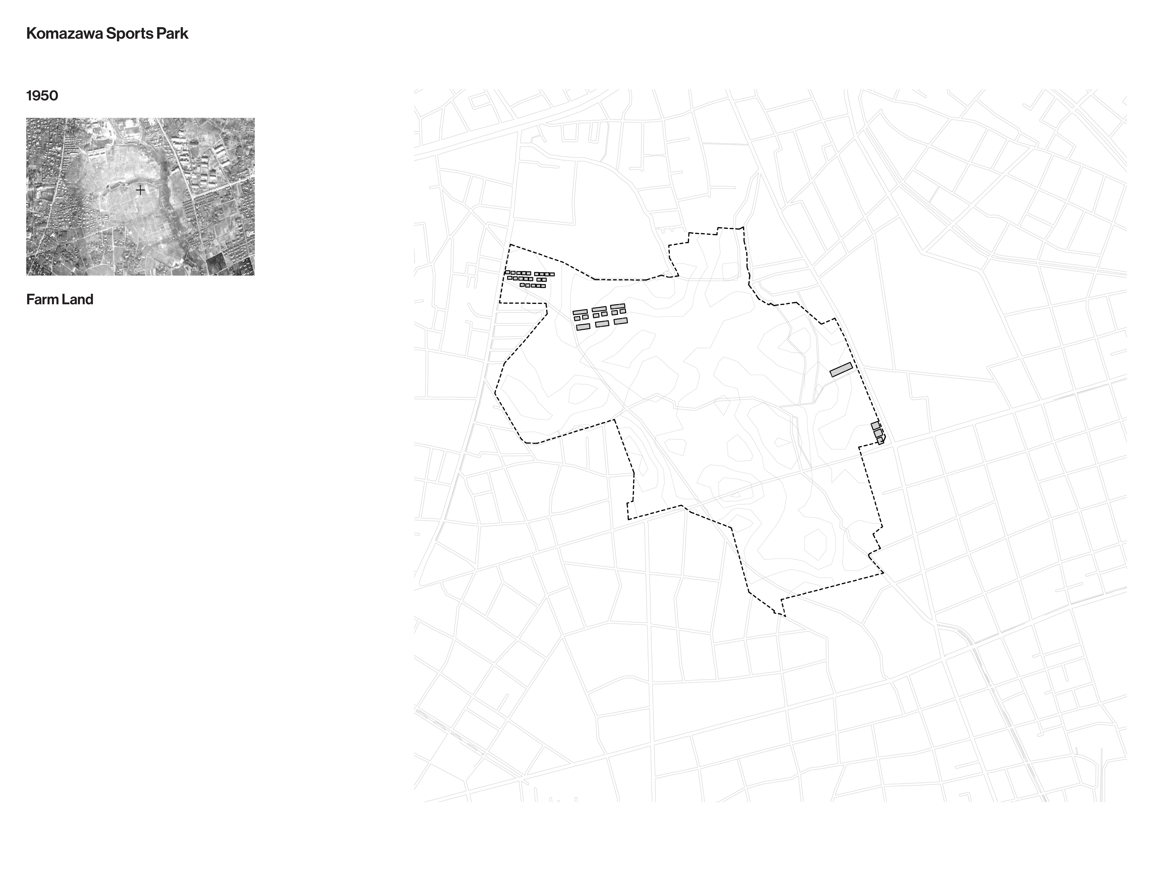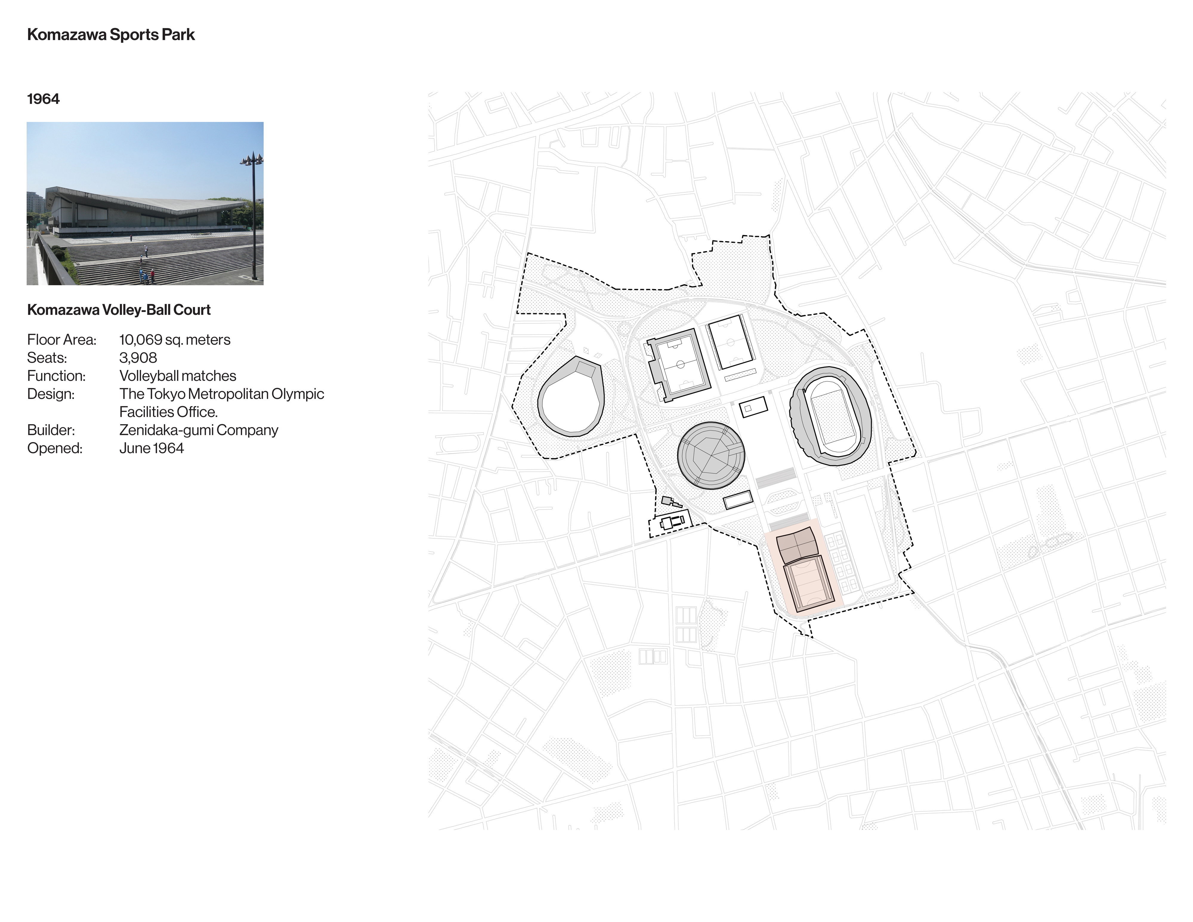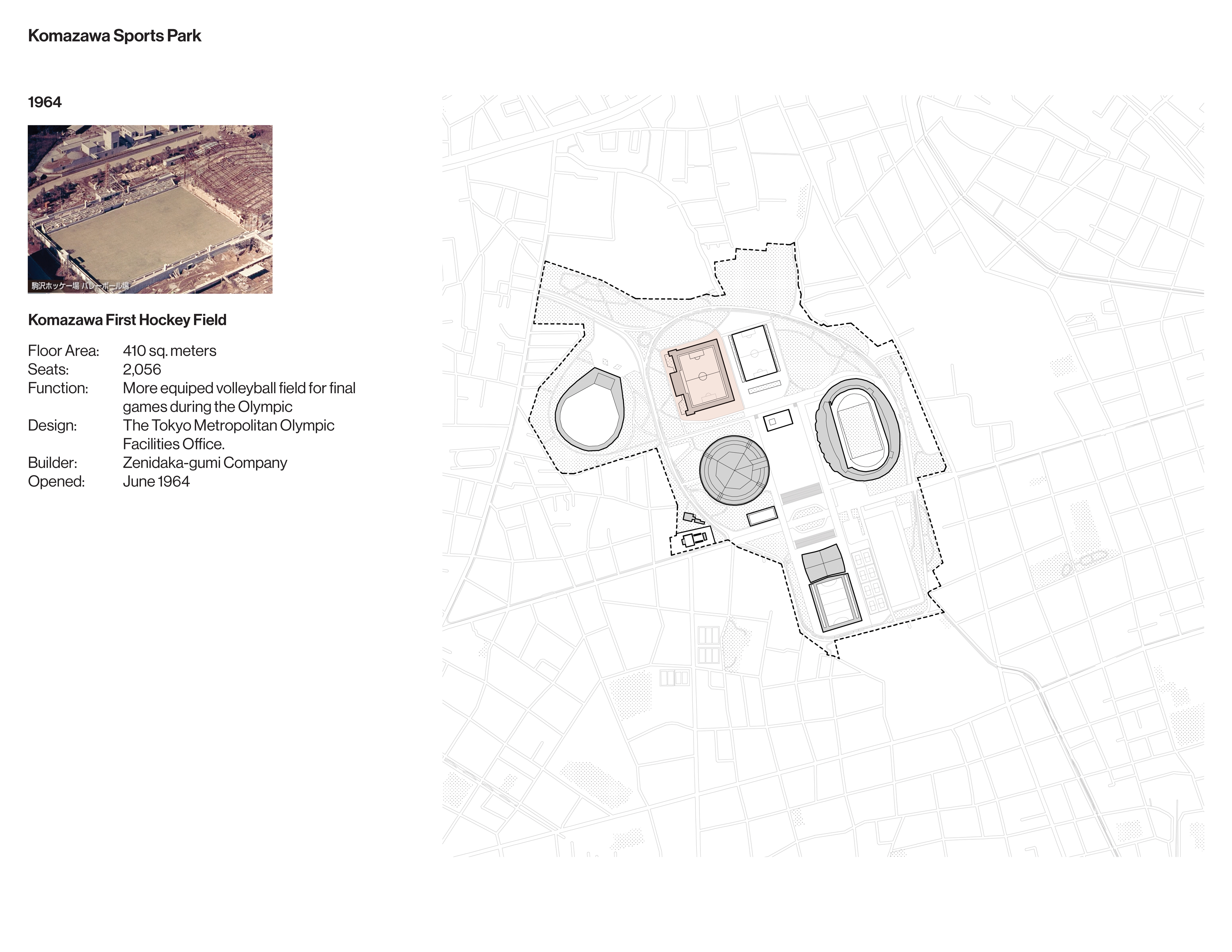 Once an exclusive golf club, the site of the Komazawa Olympic Park was identified as a venue for the 1940 Olympics before its cancellation. When the site was repurposed for the 1964 Games, a team led by University of Tokyo professor Eika Takayama devised a new master plan. Komazawa Olympic Park is unusual among Olympic sites for its close integration with surrounding residential districts.