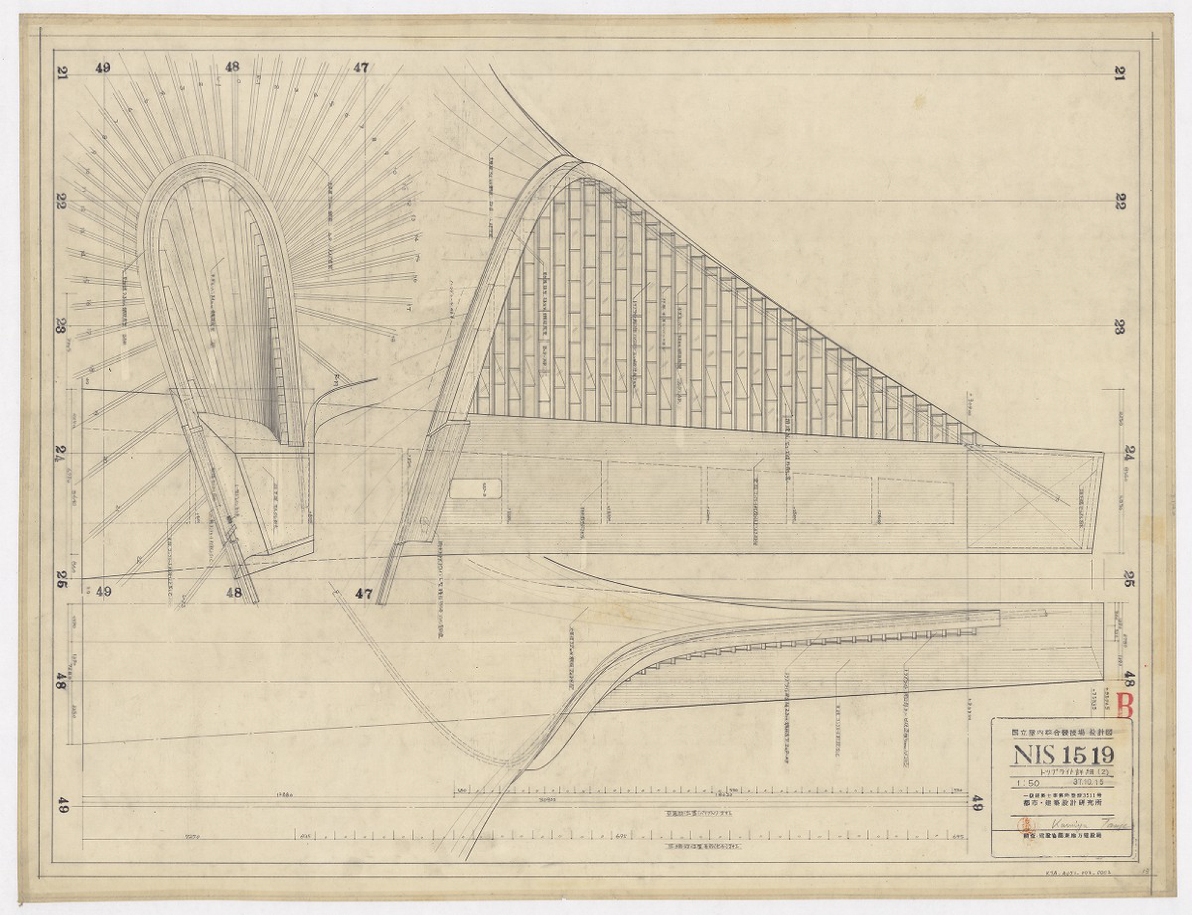 The Kenzō Tange Archive. Gift of Mrs. Takako Tange, 2011. Yoyogi Gymnasium (Tokyo). Layout drawing. Courtesy of the Frances Loeb Library, Harvard University Graduate School of Design.